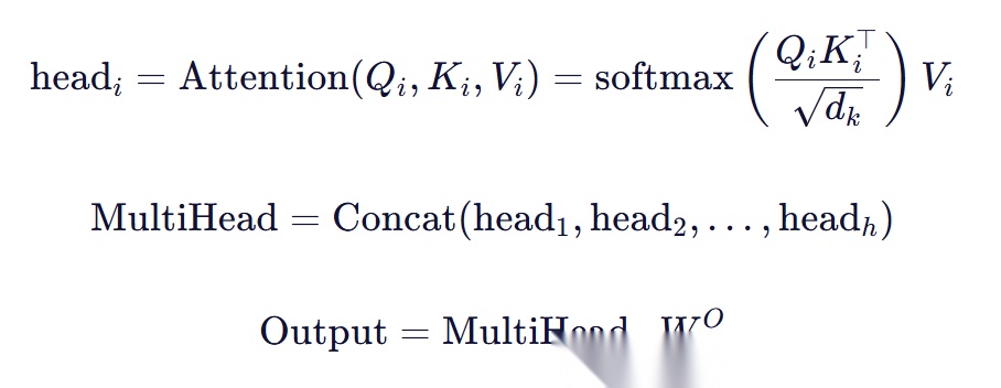 前面讲的Self-Attention就是自注意力了,而Transformer中使用的是多头自注意力机制,即Multi-Head Self-Attention。首先对于进入Encoder模块的矩阵X乘以权重矩阵Wq、Wk、Wv计算得到Q、K、V。然后对Q、K、V按照词嵌入向量的维度进行均分,例如本来是512维的词嵌入向量分为4个头:(Q1、K1、V1)、…、(Q4、K4、V4),每个头对应的向量有128维。再分别计算每个头各自的注意力Attention(Q1、K1、V1)、…、Attention(Q4、K4、V4),注意公式中要除以的dk从512变为128了,然后将结果按顺序拼接为一个大矩阵,拼接后的大矩阵一般还会使用另一个权重矩阵W做一次线性变换。多头机制本质上是为了让模型能够同时从多个不同的表示子空间中学习信息交互,从而提升表达能力和建模灵活性。计算公式如下: