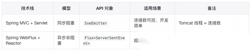 在 MCP 体系里,SSE 就是"用一次超长时间的 HTTP 下载"来伪装成服务器主动推送;规范极简(4 个固定字段),浏览器原生支持,Spring 既可用同步阻塞的 SseEmitter,也可用响应式的 Flux<ServerSentEvent> 实现。