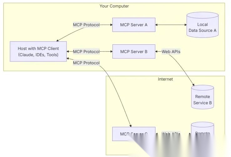 Remote Services: 可通过互联网(例如通过 API)访问的外部系统,MCP 服务器可与之连接。