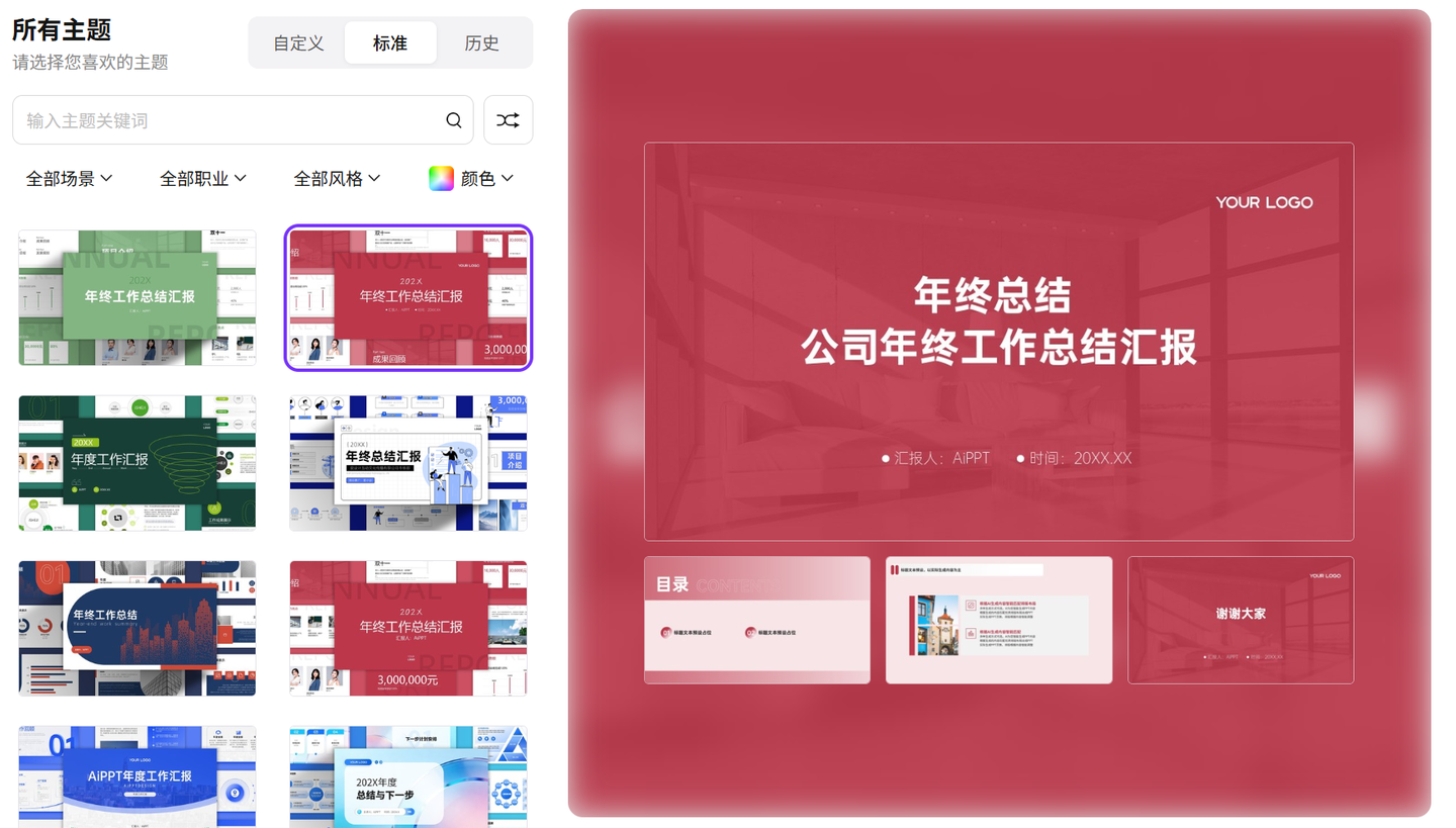 作为一款主打智能生成的PPT工具,AIPPT在我多次年度总结PPT制作中都发挥了重要作用,尤其适合时间紧张、对设计没太多经验的朋友。它的核心优势在于“智能高效”,能最大程度降低年度总结PPT制作的门槛。