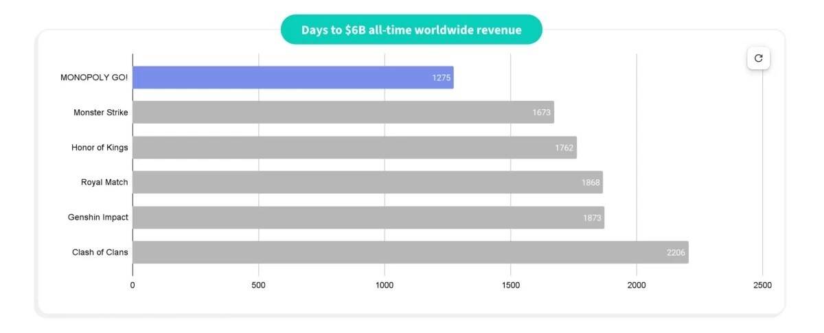 根据Sensor Tower数据,Scopely的《Monopoly Go》在2025年突破了60亿美元的收入(App Store+Google Play),创下了纪录。该游戏仅用1275天(不到三年半)就达成这一里程碑,超越了Mixi的《Monster Strike》(1673天)和腾讯的《王者荣耀》(1762天)。目前,《Monopoly Go》每月收入约2亿美元,是全球收入最高的手游之一,位列App Store和Google Play所有游戏历史收入第14位。
