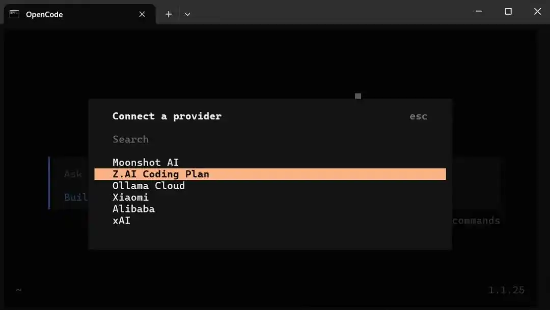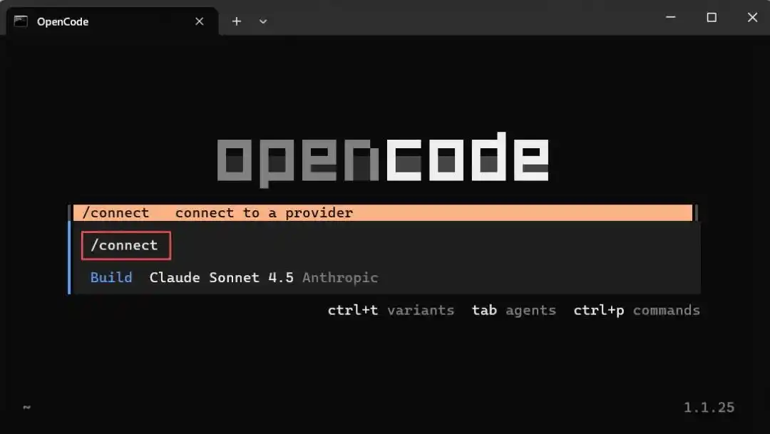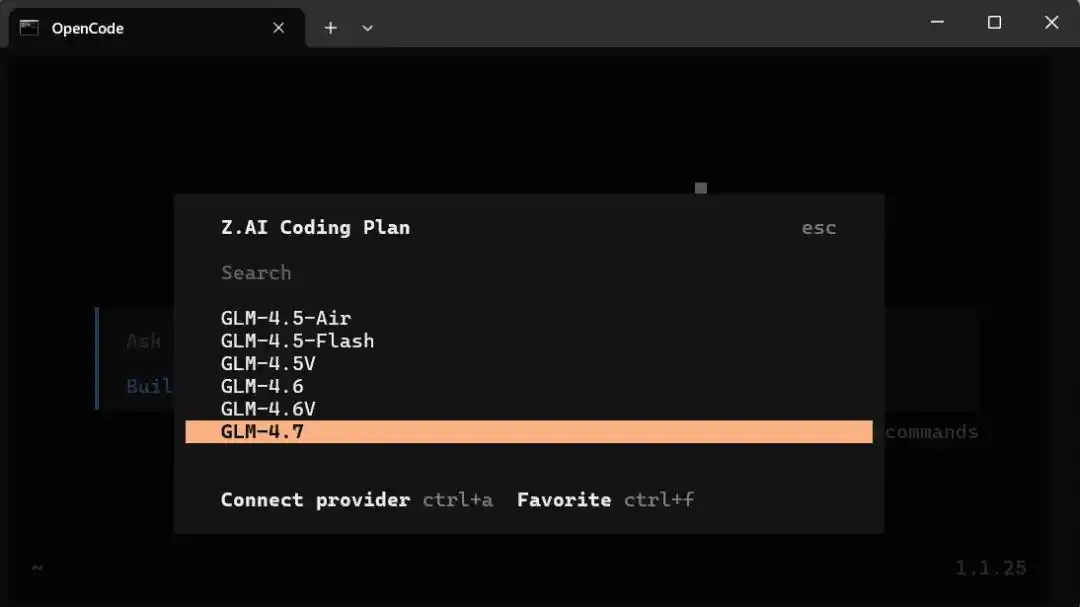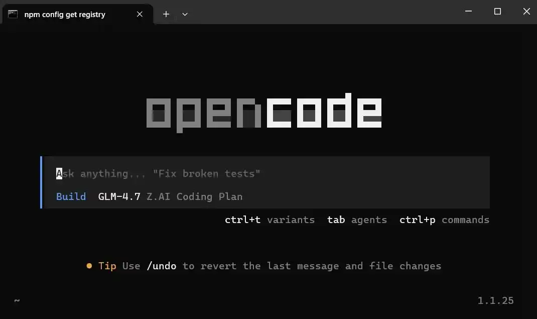 在重新开打的新CMD窗口中,输入命令:opencode,你会看到如下界面,恭喜你OpenCode + GLM-4.7配置成功! 你可以放心地开始让Open Code帮你写代码了!