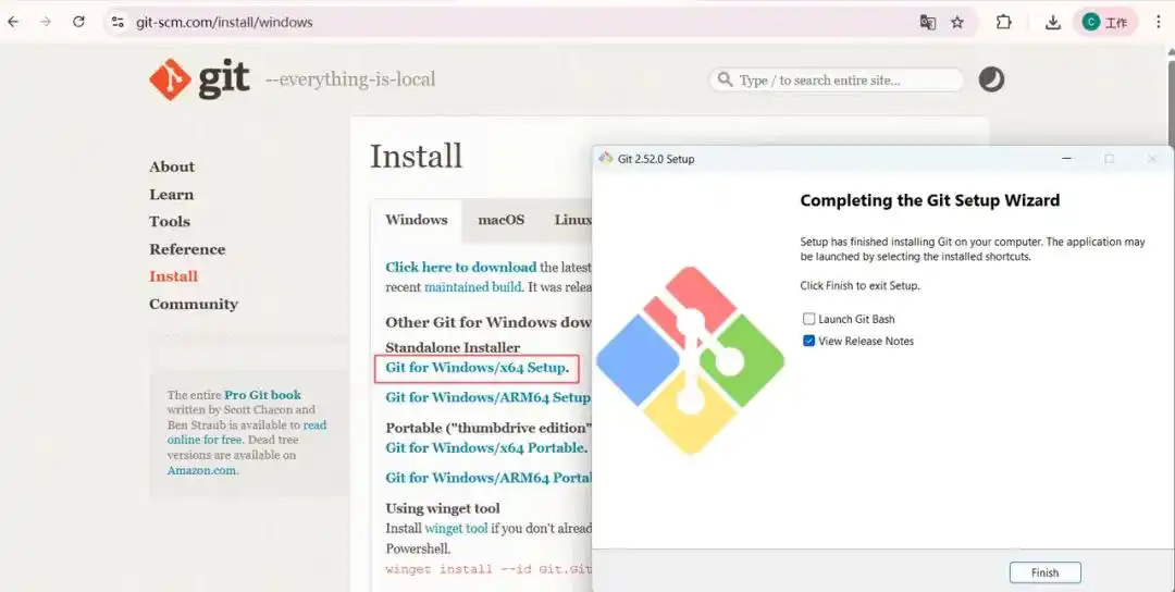 下载Git for Windows/x64 Setup。下载后就像安装微信一样,双击运行,保持默认安装选项一路点击 'Next'(下一步)直到 'Finish'(完成)即可。