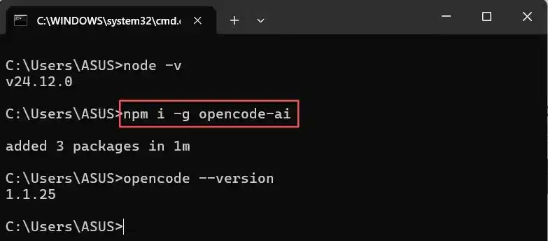 打开 Windows 的 CMD (命令提示符), 用下面的命令启动OpenCode
