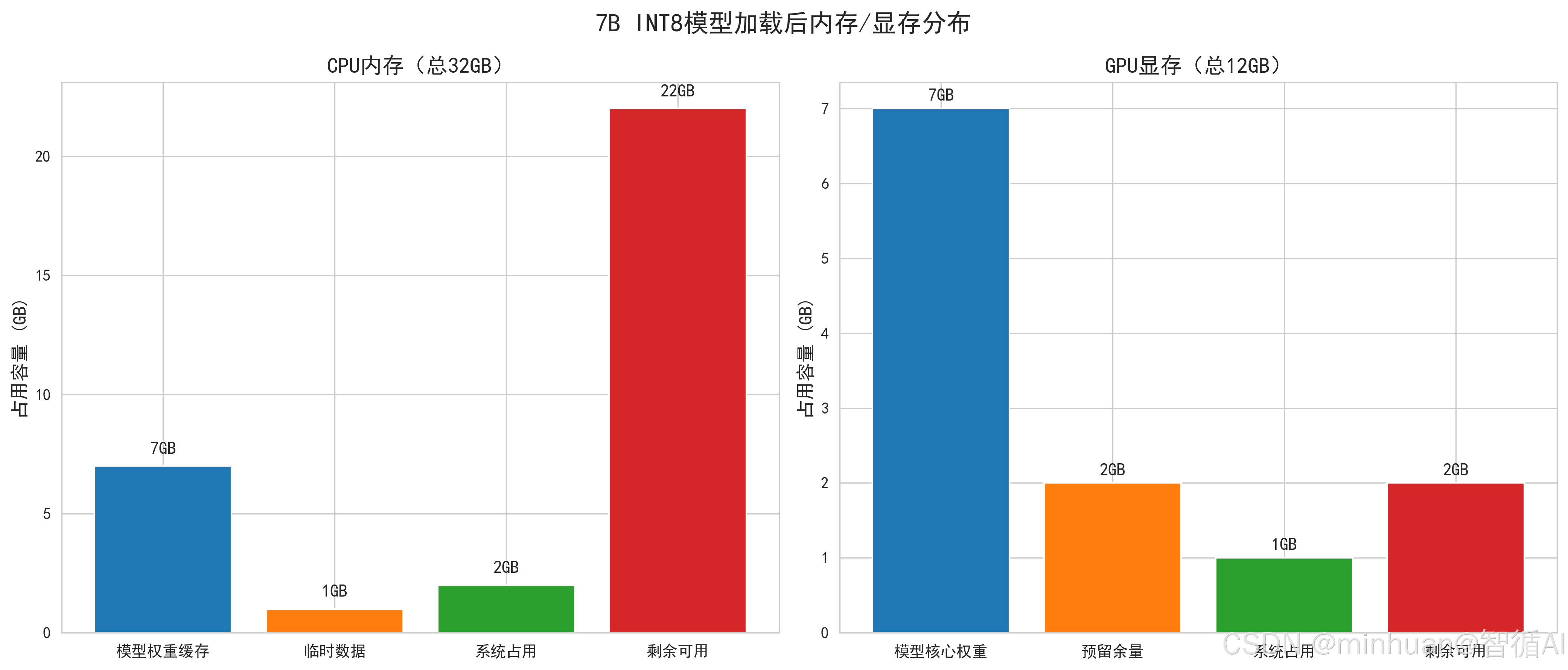- INT8量化:基础占用=7×10⁹ ×1字节=7GB;总占用=7GB×1.3≈9.1GB(需单卡12GB显存,如RTX 3060/4070);