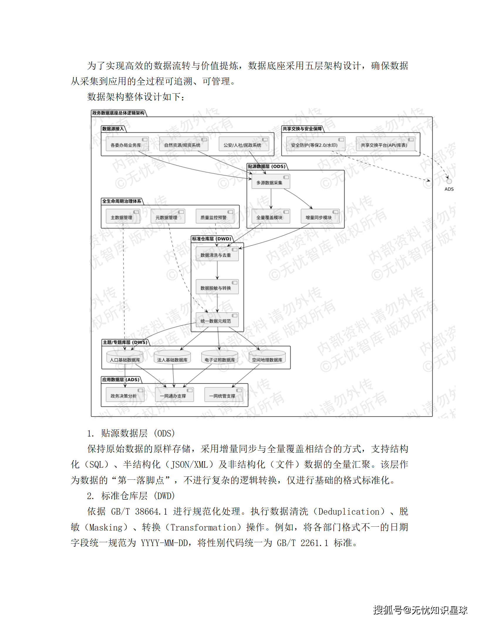 - 分层数据架构:采用贴源数据层(ODS)、标准仓库层(DWD)、主题库层(DWS)、应用数据层(ADS)的五层架构,确保数据从采集到应用的全过程可追溯、可管理。