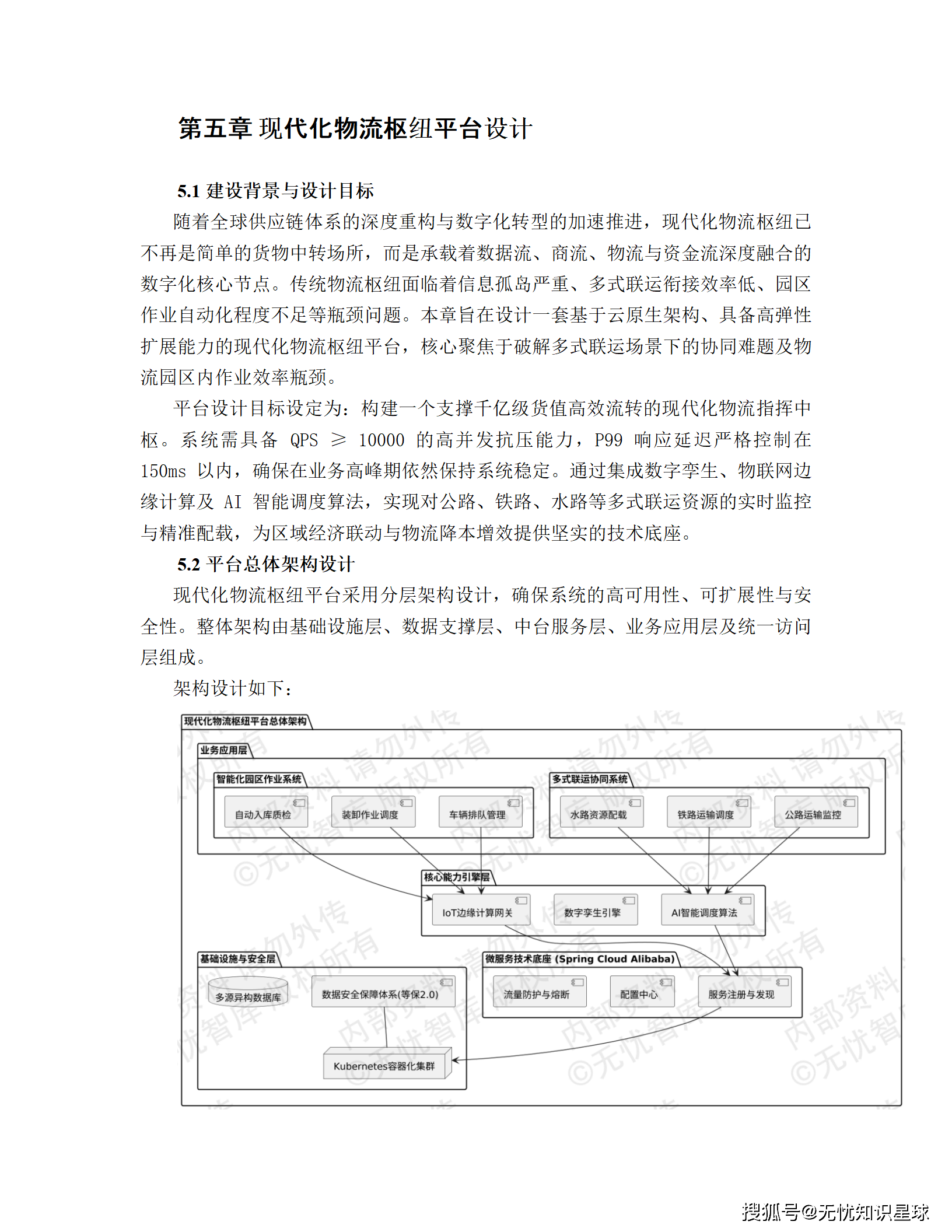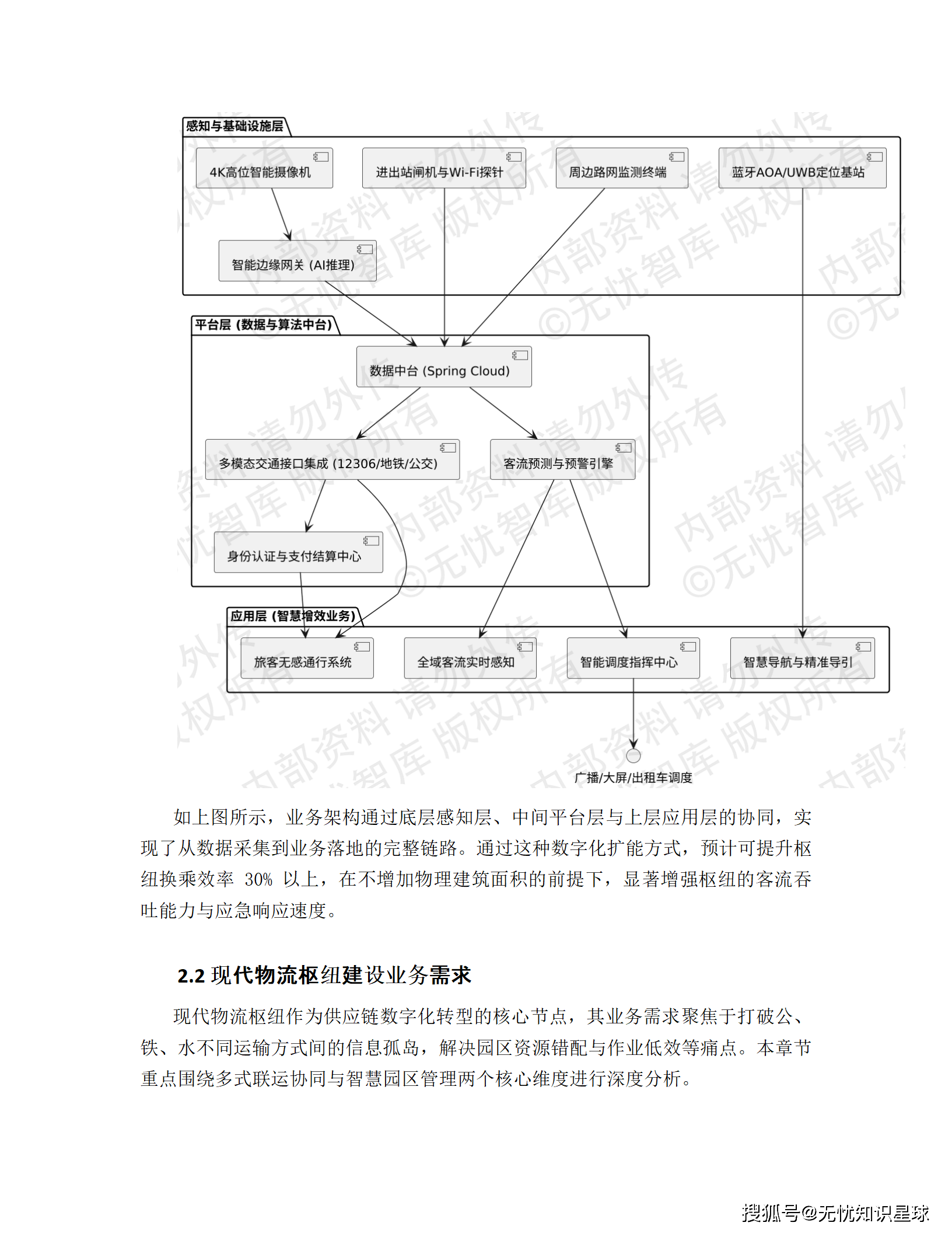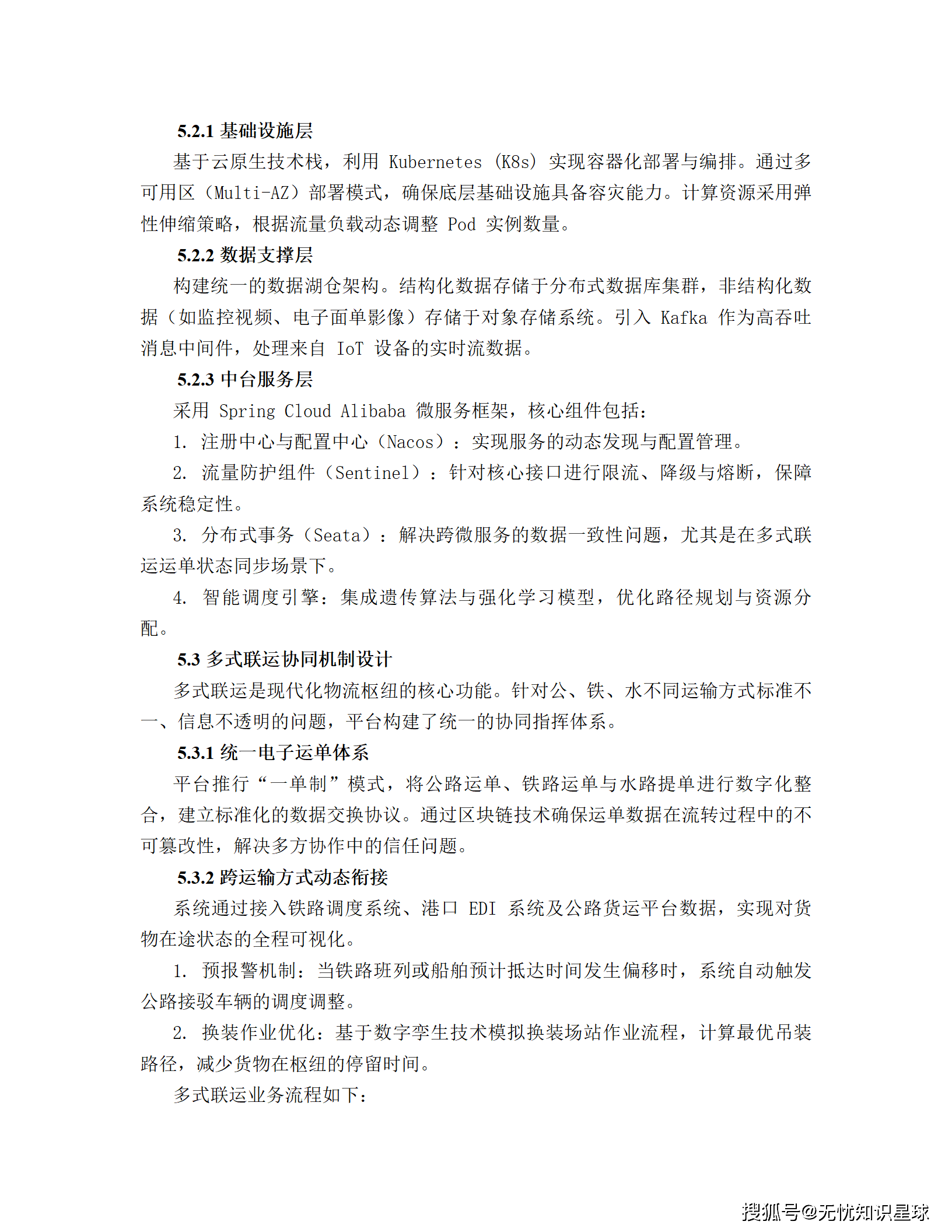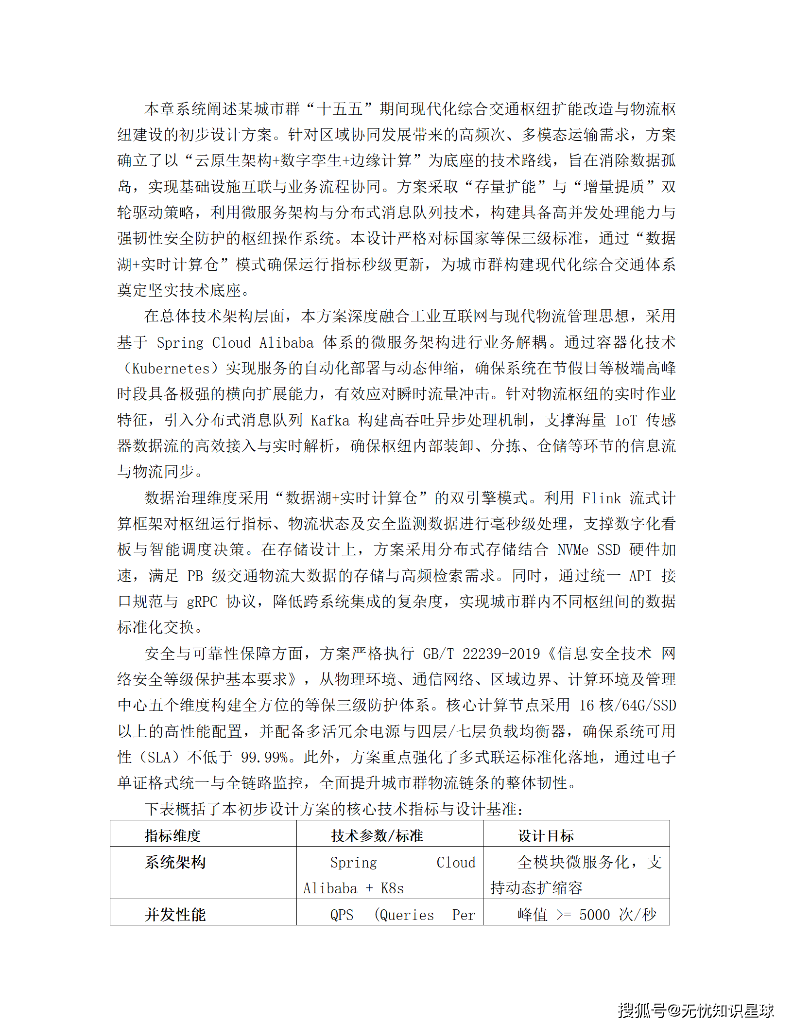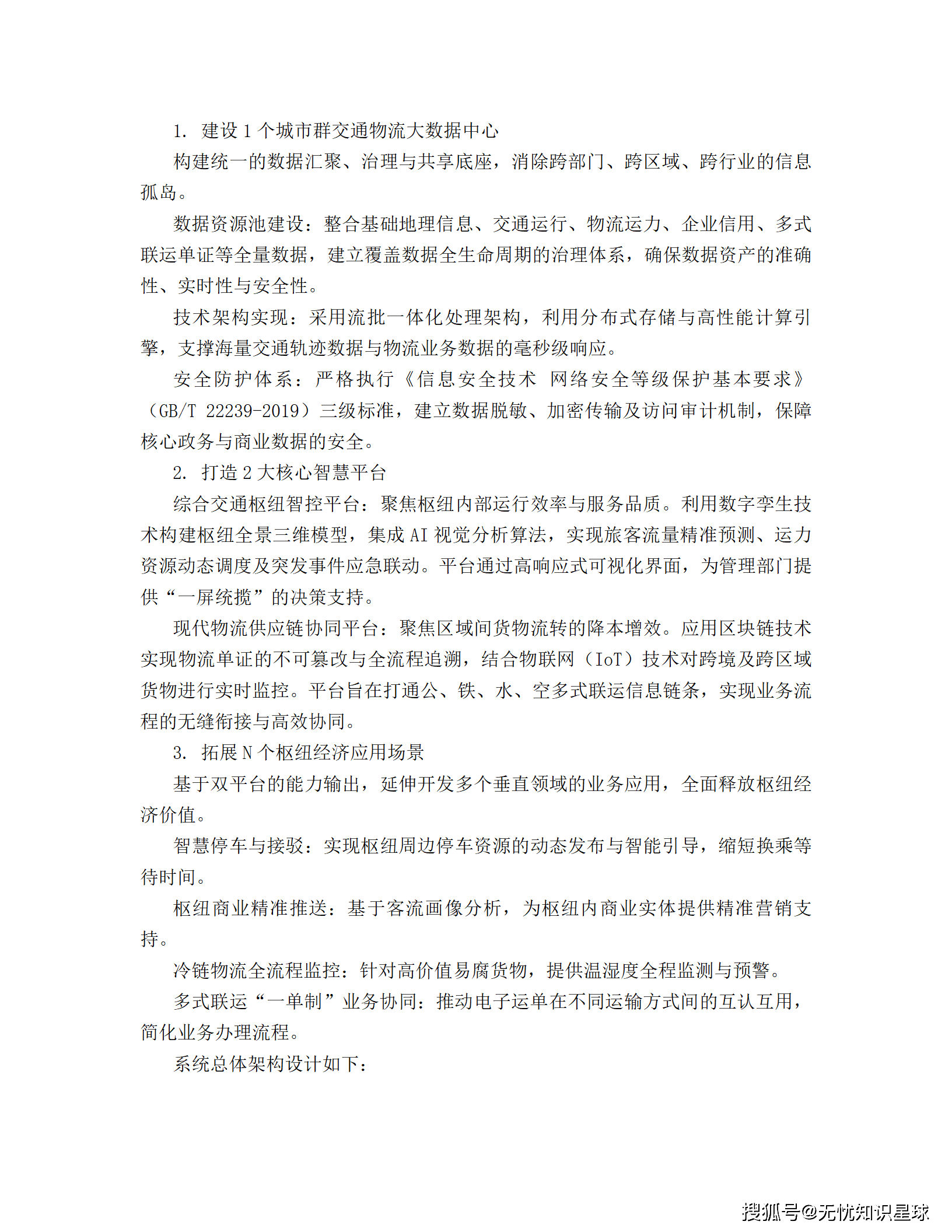 《城市群“十五五”综合交通枢纽智能化改造方案》摘要:该方案以“云原生+数字孪生”为核心技术,构建“1+2+N”智能体系(1个大数据中心、2个智慧平台、N个应用场景),实现交通枢纽从物理改造到系统重塑的全面升级。通过微服务架构、区块链追溯、AI决策等创新技术,解决当前枢纽运行效率低、物流成本高等痛点,预计降低物流成本10%以上,提升换乘效率30%。方案突出安全可控设计,满足等保三级要求,同时建立经济