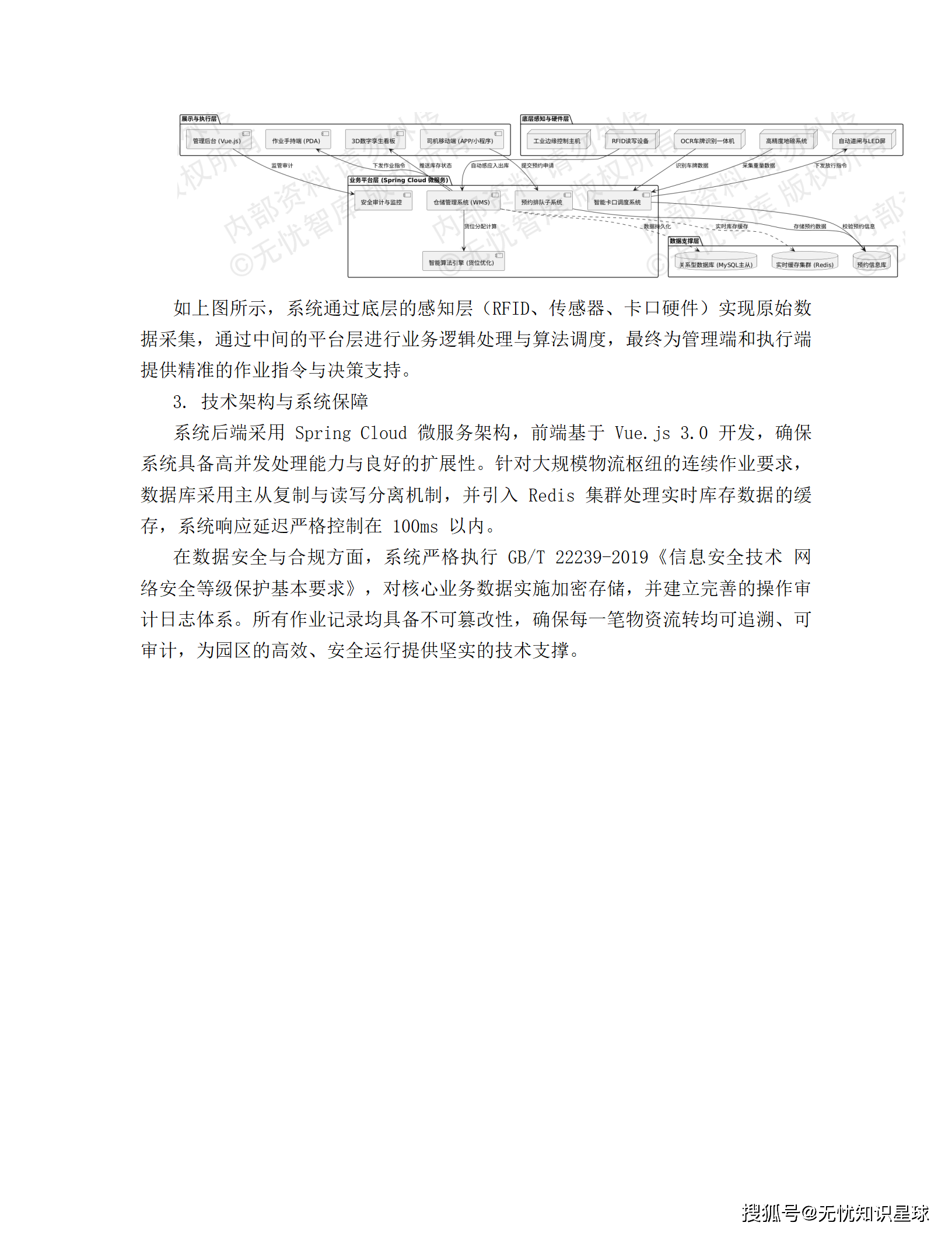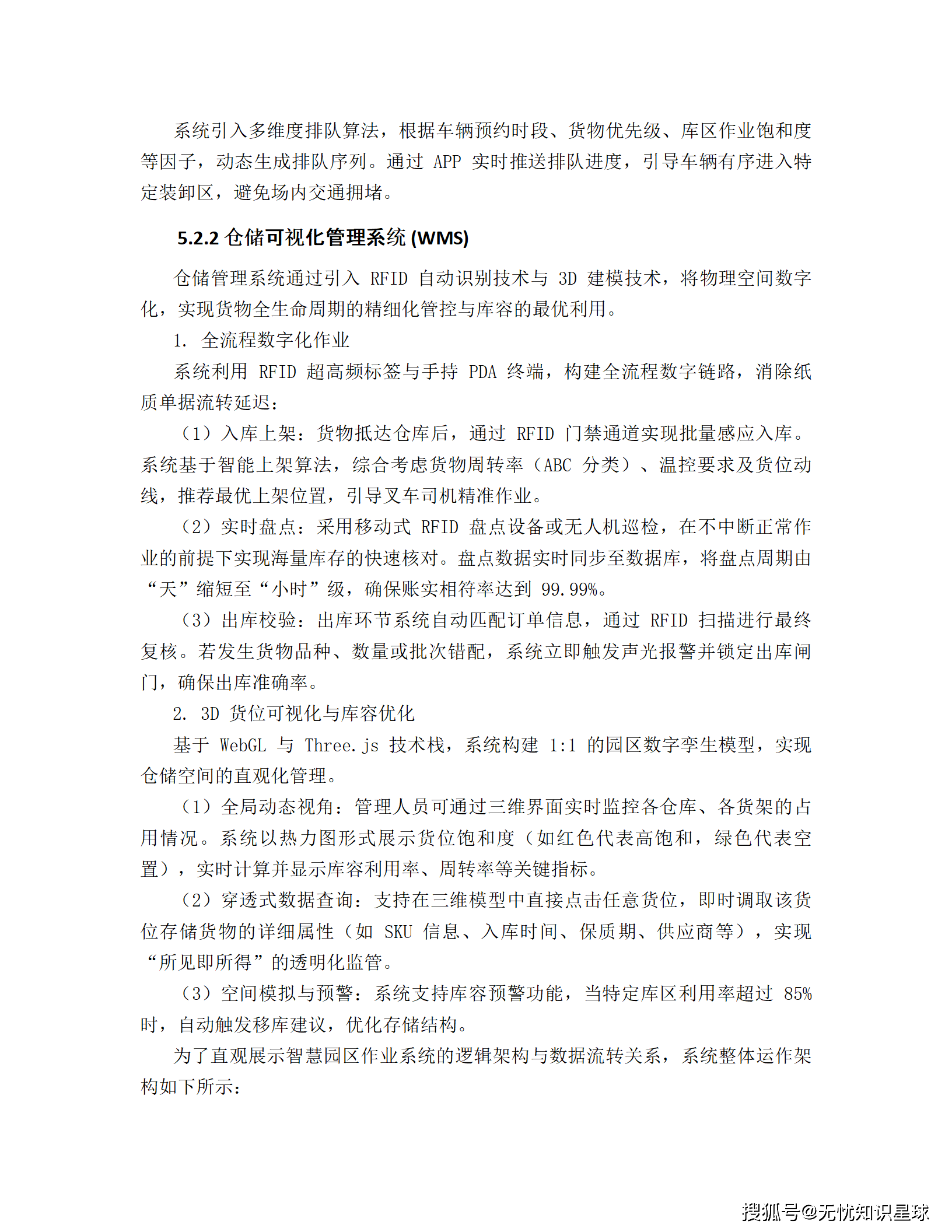 - 智慧物流园区作业系统:智能卡口:通过OCR识别、自动称重、预约排队算法,实现车辆“预申报、秒识别、自动过”,单车入园全过程耗时控制在15秒以内。仓储可视化管理 (WMS):利用RFID技术和3D建模,实现货物全生命周期的精细化管控。管理人员可在三维界面中“所见即所得”地监控库容、盘点库存、校验出库,确保账实相符率高达99.99%。