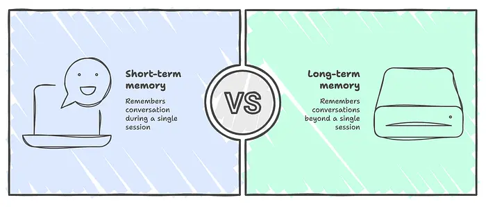 短期记忆类似于计算机的 RAM,应用在单次会话期间"记住"对话内容,会话结束后就会清空。长期记忆则像硬盘驱动器,能够跨会话持久保存信息,即使应用重启也不会丢失。