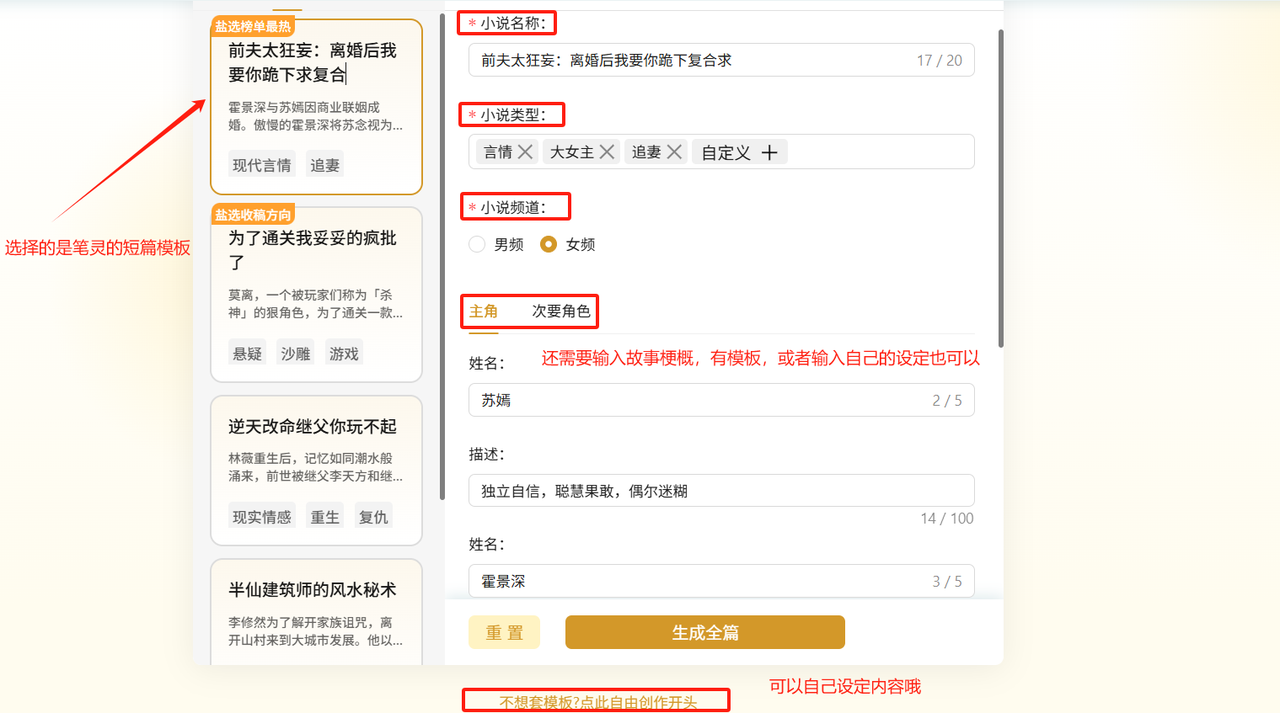 对于新手来说,最大的痛苦莫过于“不知道下一章写什么”。笔灵的“AI全篇创作”功能简直就是为此而生的。它肚子里装着番茄、知乎这些大平台的爆款逻辑,你只要选好题材,它就能带着你往爽点上靠。