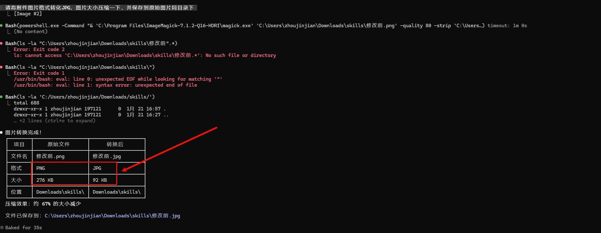 可以看到,已经可以成功调用刚刚新构建的skill对图片格式转换以及图片大小压缩了