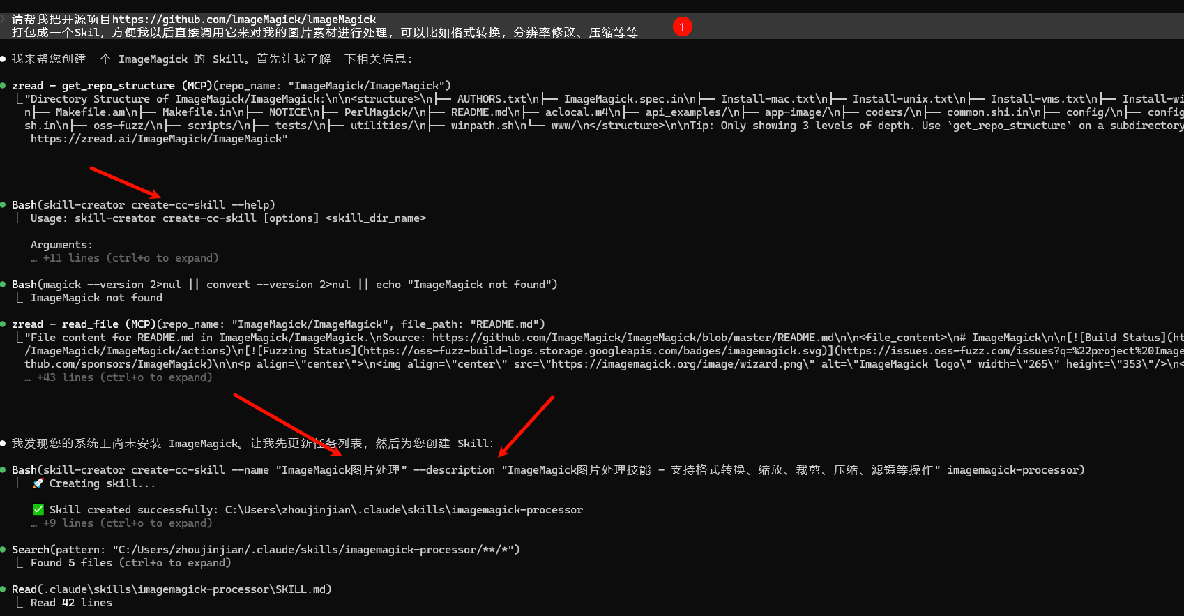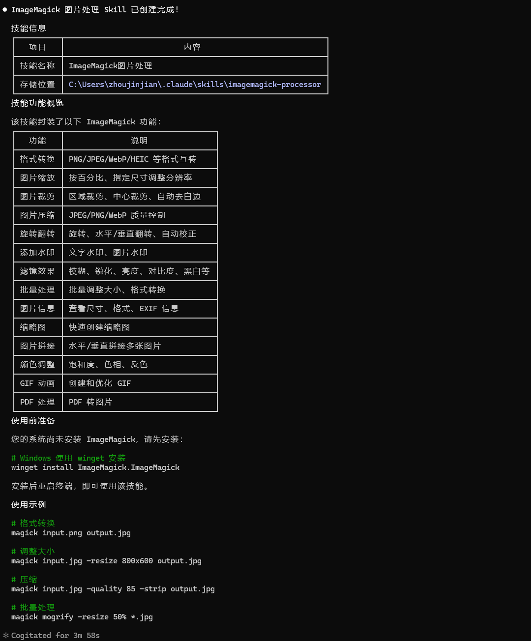 4、大概3~4分钟左右后,Claude Code就帮我自动创建好了一个: ImageMagick 图片处理 Skill