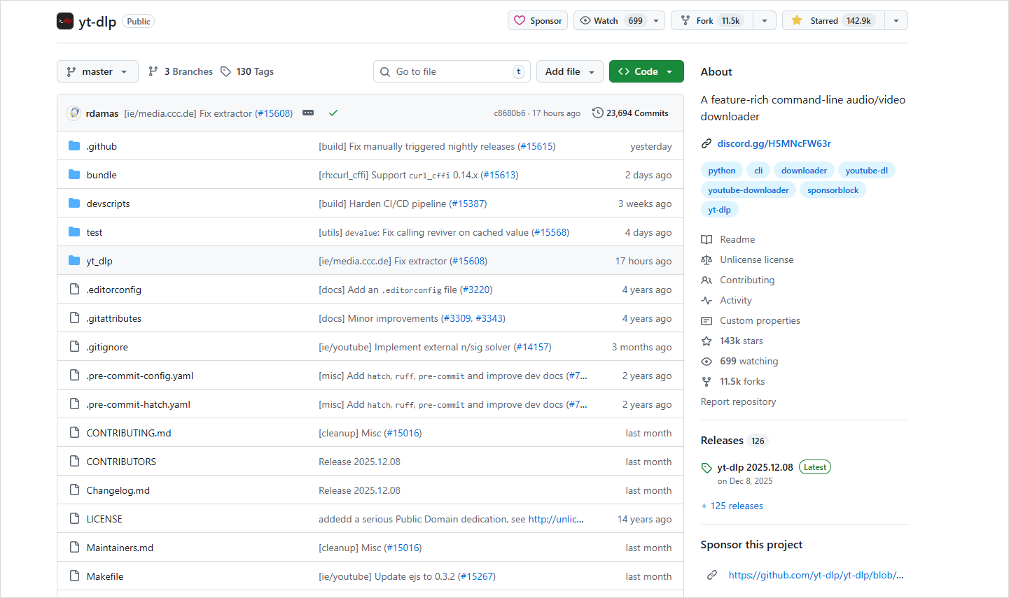 为什么说yt-dlp最为推荐?不讲其它的,光Github上143k的star,就能充分证明这点,说这个项目是Github上最伟大的项目之一,也不为过。