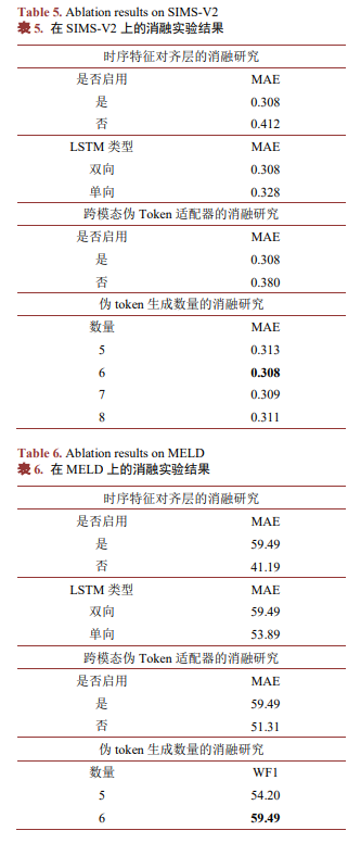 我们在SIMS-V2和MELD数据集上,分别对时序特征对齐层、跨模态伪Token适配器和伪token生成数量进行了消融研究,结果如表5和表6所示。
