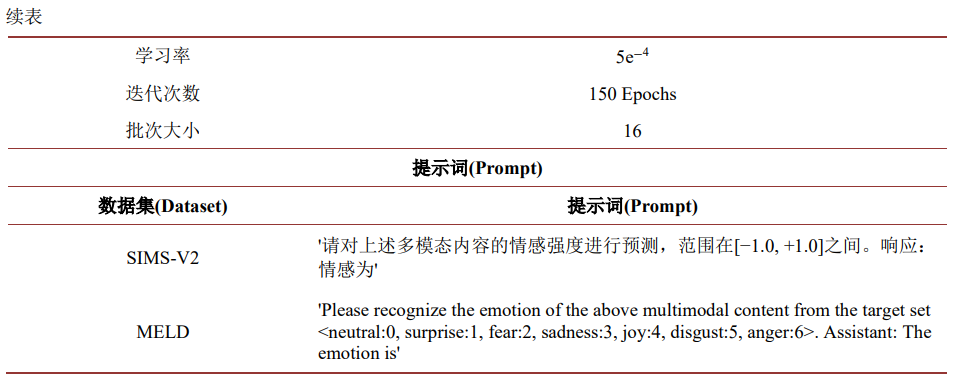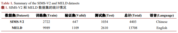 本研究在两个经典的多模态情感分析数据集上验证模型性能,分别为SIMS-V2与MELD。如表1所示,SIMS-V2是中文多模态情绪数据集,样本来自短视频片段,包含文本、视觉与音频三模态信息,并采用连续情感强度标注,能够细粒度刻画情绪变化。MELD则源自电视剧《Friends》的多角色对话场景,同样提供文本、视觉和语音模态,但使用7类离散情感标签,并包含跨轮次对话上下文。两个数据集在语言、情感标注体系、场景、数据来源等方面具有互补性,为全面评估模型的跨场景泛化能力提供了可靠基础。