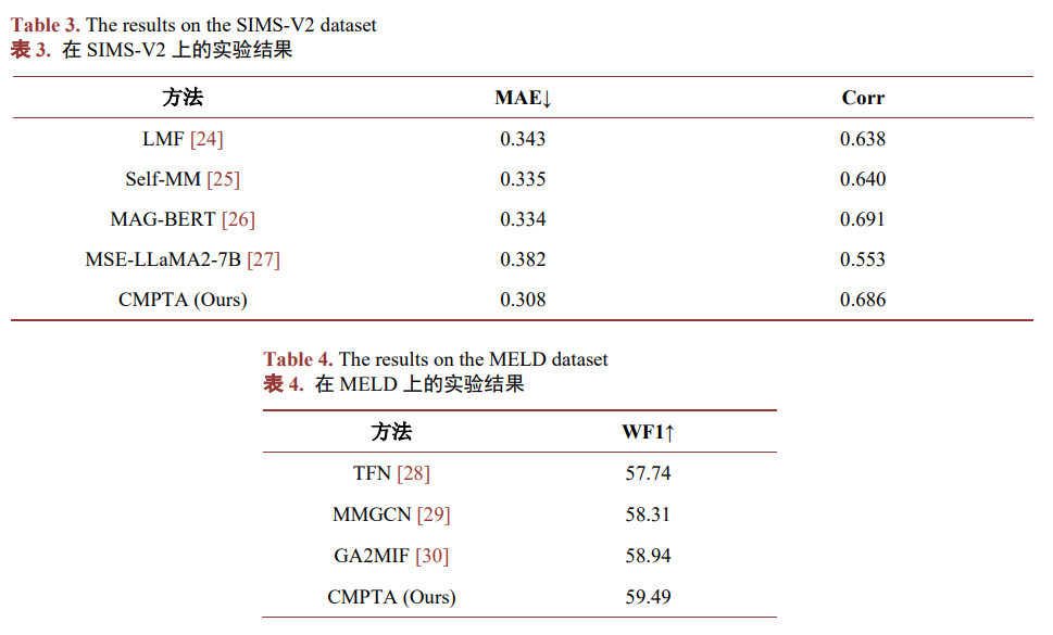 我们在SIMS-V2和MELD这两个数据集上分别进行了实验,所有的实验均保证了训练集、验证集和测试集拥有相同方式的划分,对于SIMS-V2这个数据集,我们做的是情感回归任务,评价指标为平均绝对误差,结果如表3所示,我们的方法MAE值为0.308,显著优于对比方法,说明在情感回归任务中,对多模态信息的互补性建模更加充分,能更好地捕捉情感强度的细微变化。对于MELD数据集,我们做的是情感分类任务,评价指标为加权F1分数,结果如表4所示,我们的方法WF1分数为59.49,超过现有方法,表明模型在复杂对话场景下能够更有效融合多模态信息,并缓解说话人变化和情境噪声带来的影响。