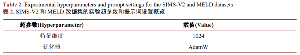 本文的CMPTA模型接受文本、视觉和音频特征作为输入,对于整个数据集,首先将数据集分为训练集、验证集和测试集,训练集用于模型的训练阶段,验证集用于训练过程中检验模型的阶段性效果,实验结果是模型在测试集上的表现。所有的模型训练和测试皆是在一个装有windows系统上的设备完成的,该设备配备GEFORCE RTX 4090显卡。模型训练的超参数见表2所示: