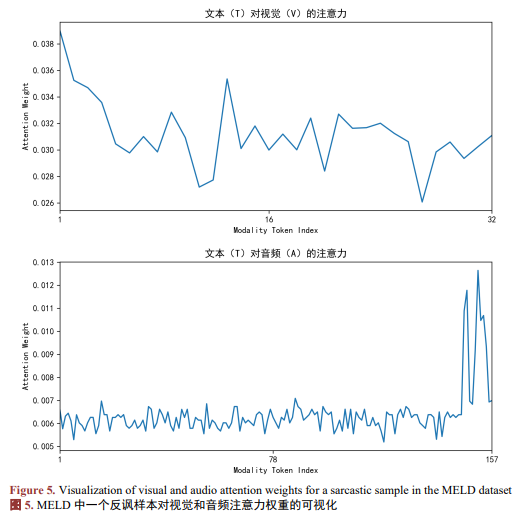 为了直观展示CMPTA的有效性,我们选取了MELD数据集中的一个反讽样本进行注意力权重可视化。文本内容为“这也太好了吧”,但在视觉上人物眉头紧锁,音频语调阴阳怪气的。传统文本模型将其误判为“积极”,如图5,而CMPTA通过引入6个视觉伪Token和音频伪Token,关注到了额外的视觉和音频模态信息,成功修正了LLM的判断,将其正确识别为“厌恶”情绪。这证明了伪Token数量为6个时成功捕获了非文本模态中的关键互补信息。