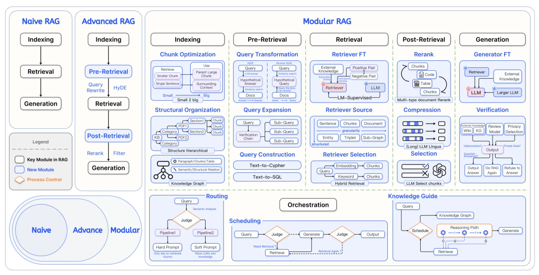 从Naive RAG到Advanced RAG:通过增加Pre-Retrieval和Post-Retrieval环节,解决了简单RAG在文档召回质量和准确率方面的局限性。