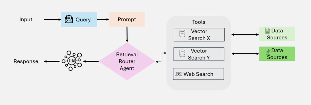 该框架核心是一个系统决策中心的Router Agent,该Agent动态处理信息检索,集成操作,比较适用于多检索源的简单问答场景。