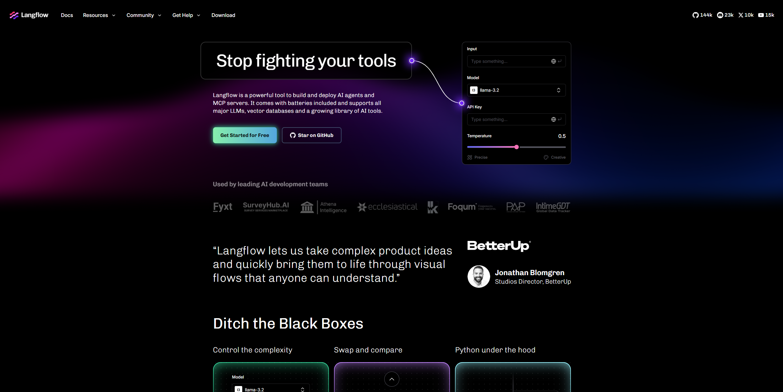 开发人员可以直观地安排多智能体之间的对话,管理内存和检索操作,然后将这些流程以 API 或独立应用程序的形式进行部署。这种易用性和灵活性使得 Langflow 在 GitHub 上获得了约 14 万个星标。通过将复杂的人工智能智能体流程的创建过程变得民主化(无需大量编码),Langflow 吸引了一支由数据科学家和工程师组成的活跃社区,他们希望开发和分享基于 LLM 的应用程序。