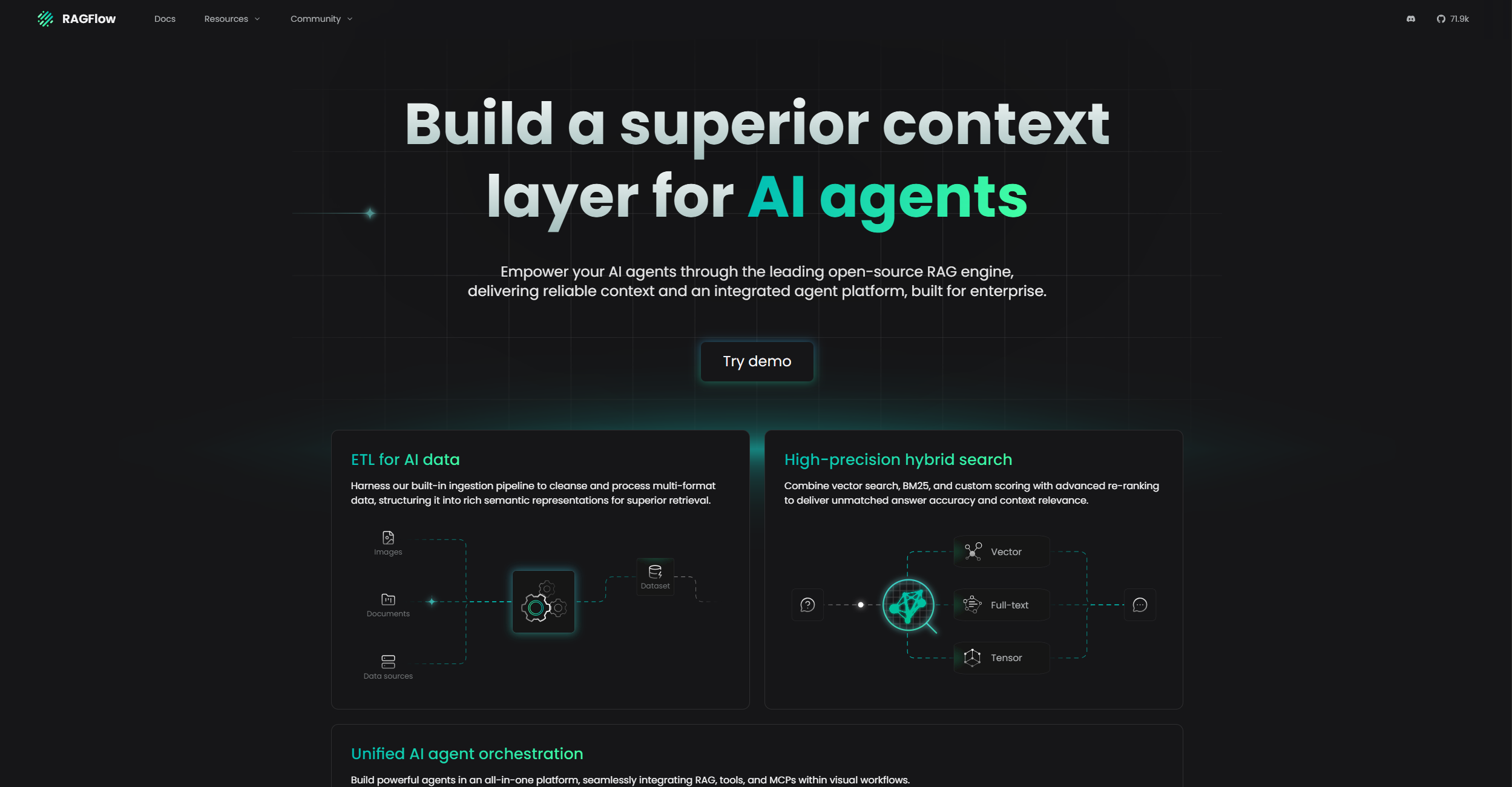 RAGFlow 是一个用于“检索增强生成”的开源引擎,它将前沿的 RAG 技术与智能体能力相结合,为大型语言模型构建了一个更优质的上下文层。简单来说,RAGFlow 帮助开发者构建能够搜索和分析外部知识(文档、数据库、API)并生成答案的 AI 应用程序——这对于企业聊天机器人、助手和数据分析代理来说是一项关键功能。它提供了一个端到端的框架:从文档摄取和向量索引到查询规划以及根据需要获取信息的工具使用智能体。