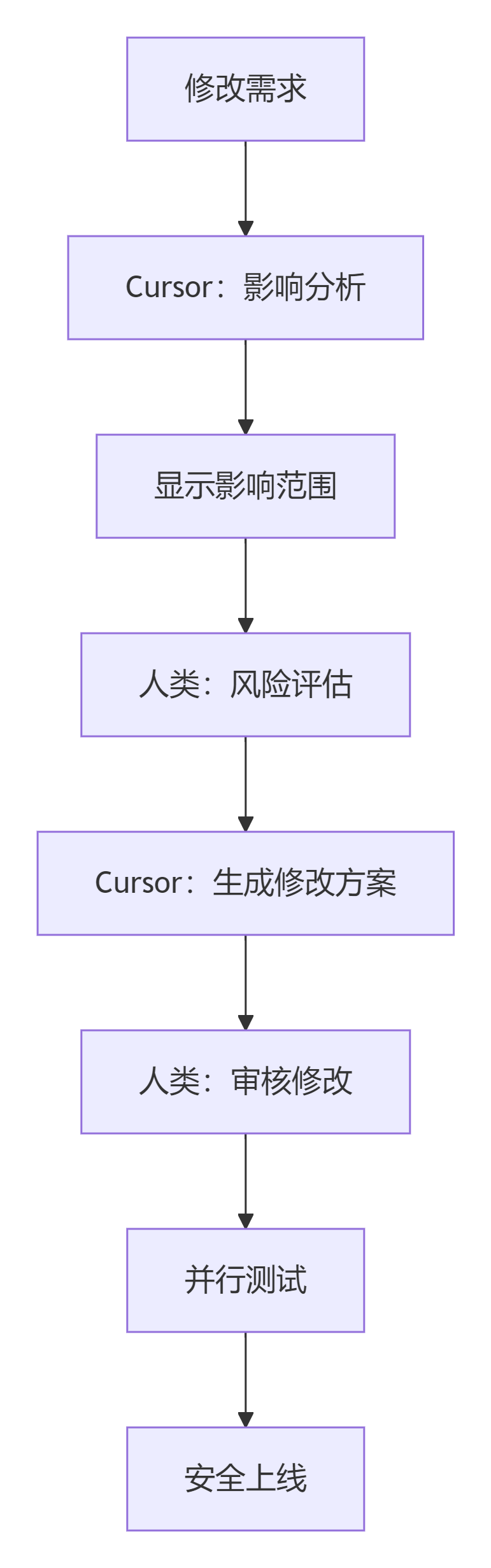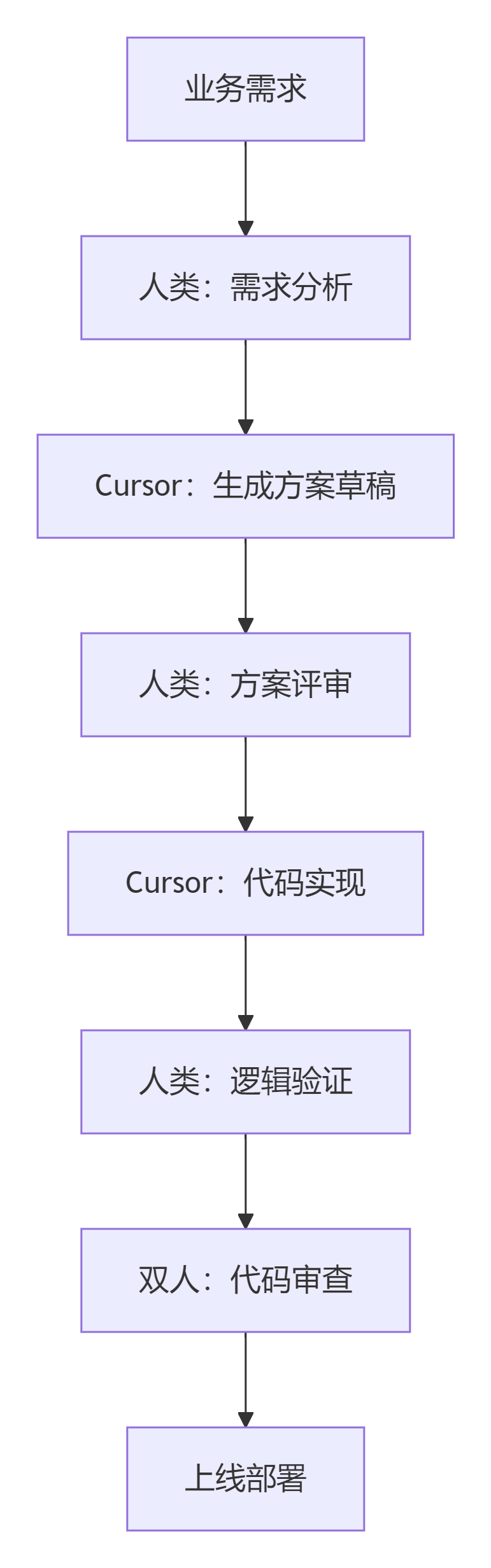 AI(Cursor)负责: - 生成标准代码模板 - 自动补充注释 - 代码优化建议 - 文档自动生成 - 重复性工作 人类工程师负责: - 业务逻辑设计 - 架构决策 - 复杂算法实现 - 代码审查 - 质量把关