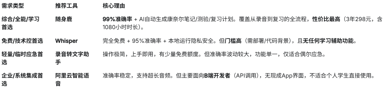 其他工具各有侧重:Whisper适合技术背景的用户追求免费和隐私,录音转文字助手适合轻度应急使用,阿里云智能语音交互适合机构级部署。但对于大多数学生来说,随身鹿的综合能力和性价比都是最优选择。