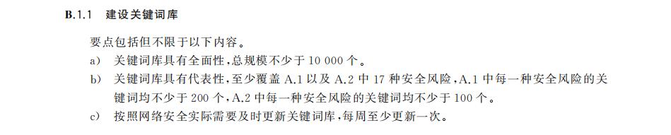 关键词库需覆盖17类安全风险,总规模不少于10000个,其中附录A.1每类风险关键词不少于200个,A.2每类不少于100个,且每周至少更新一次。同时结合分类模型与人工抽检,弥补关键词匹配短板,精准识别隐含、上下文相关风险。