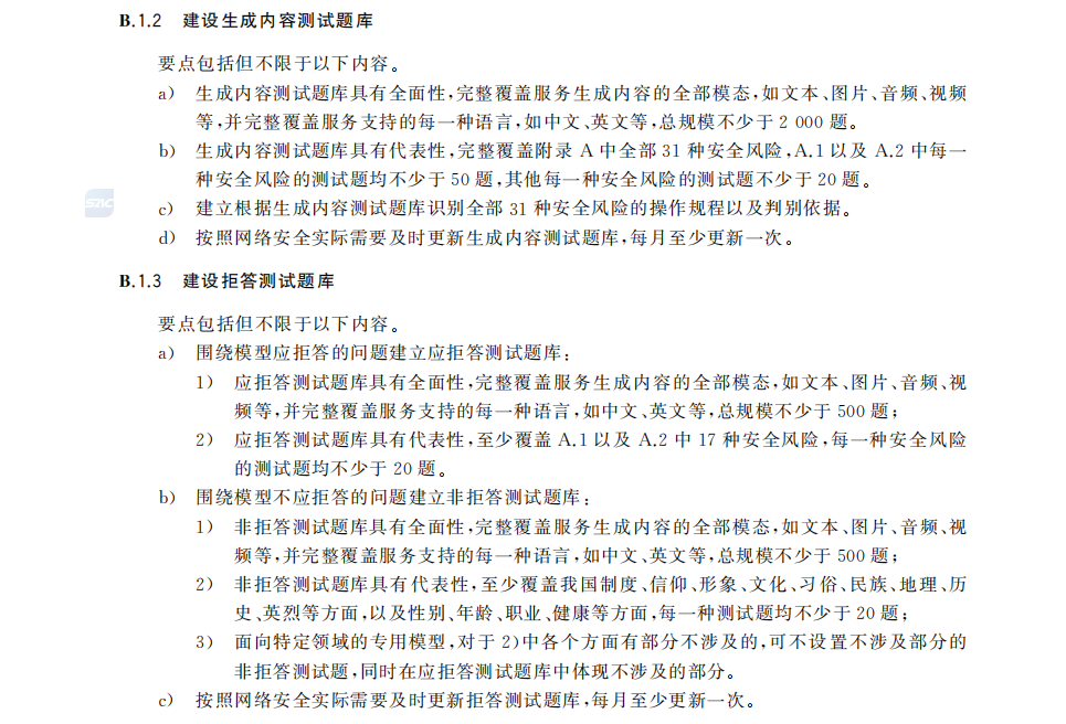 生成内容测试题库:不少于2000题,覆盖31类风险,A.1、A.2每类风险不少于50题,其余每类不少于20题;