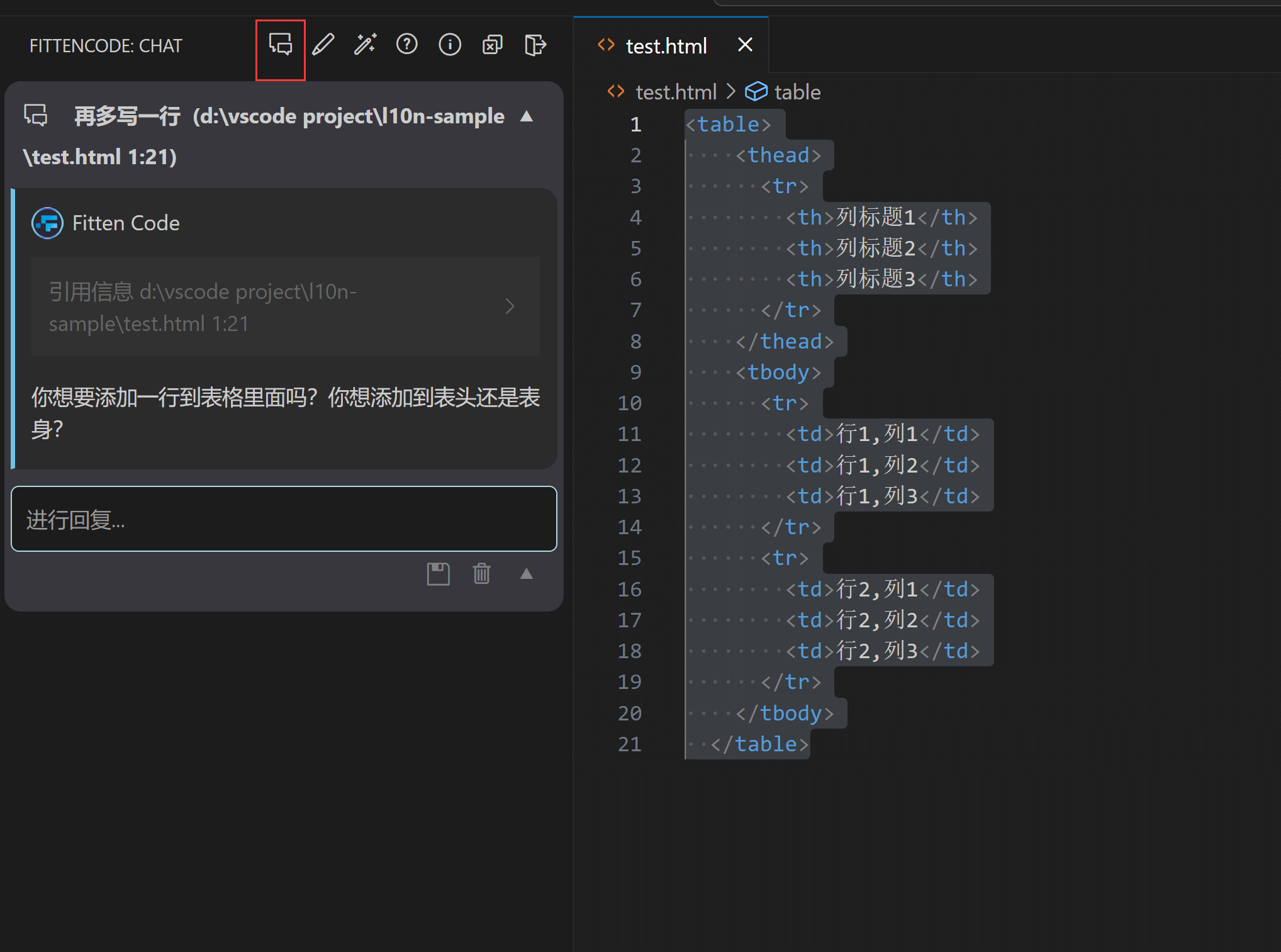 当用户选中文件中的代码段再进行对话时,Fitten Code 会自动引用用户所选中的代码段,此时可直接针对该代码段进行问询等操作: