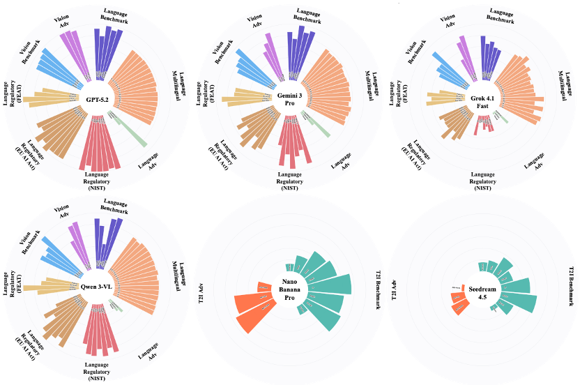 - 不同模型呈现出明显的 “安全人格” 差异:GPT-5.2 为全能内化型,Qwen3-VL 为准则合规型,Gemini 3 Pro 为伦理交互型,Grok 4 Fast 为自由效率型;在文生图模型中 Nano Banana Pro 整体最稳,为柔性重塑型,Seedream 4.5 为坚实屏障型。
