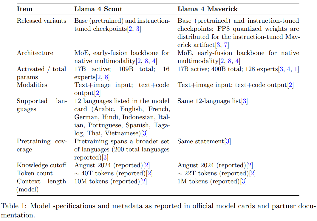 此外,这份报告还总结了「与再分发和衍生命名相关的许可义务,并回顾了公开描述的安全措施和评估实践。其目的是为需要关于 Llama 4 精确、有来源依据事实的研究人员和从业者提供一份紧凑的技术参考。」
