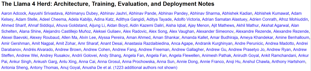 尽管如此,这篇报告还是将 Llama 4 项目的所有参与者都加入到了作者名单中 —— 超过 1300 名,足足 5 页!因此,我们可以大体上认为这份报告就是来自 Llama 4 团队,尽管其中不少人现在已经从 Meta 离职,比如前 Meta FAIR 团队研究总监田渊栋。