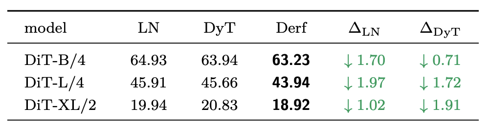 结果显示,Derf 在所有 DiT 模型规模下的 FID 都低于 LayerNorm 和 DyT,进一步验证了其在扩散 Transformer 中的有效性。