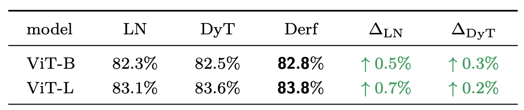在不同模型规模下,Derf 的 Top-1 准确率均高于 LayerNorm(LN)和 DyT,充分证明了其在 ViT 架构中的有效性。