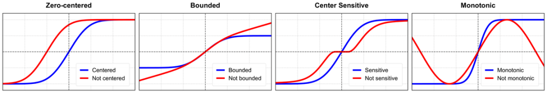 研究团队首先系统性地研究了逐点函数的内在性质如何影响训练动态和最终性能,重点关注四个基础且具有代表性的属性:零中心性(zero-centeredness)、有界性(boundedness)、中心敏感性(center sensitivity)以及单调性(monotonicity)。