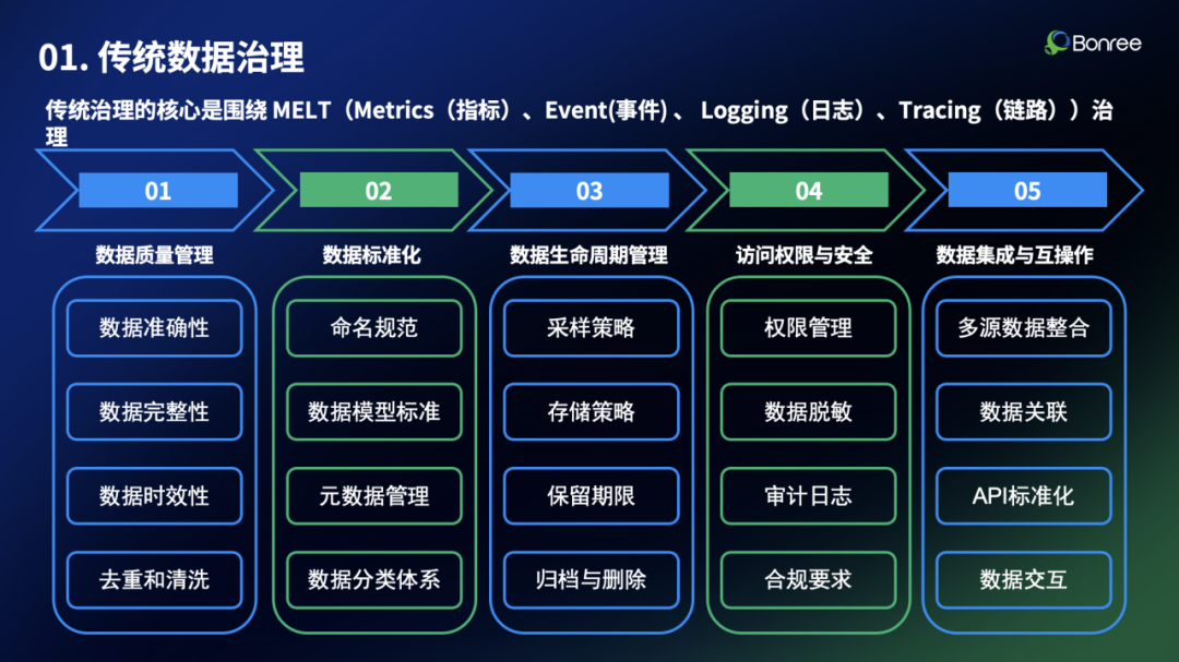 传统可观测性数据治理的核心是MELT体系——Metrics(指标)、Event(事件)、Logging(日志)、Tracing(链路)。这套框架主要聚焦于系统运行状态的监控与优化,解决数据的合规性、成本与一致性问题。
