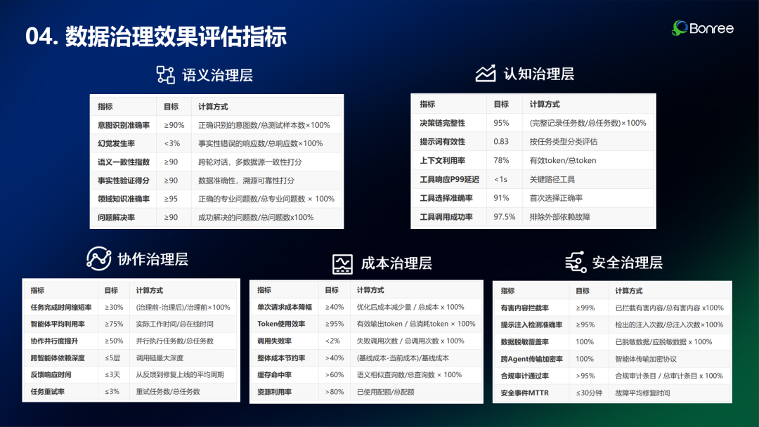 语义层是新体系的核心,关注内容质量与意图准确性。它不仅仅追求数据质量,更关注意图一致性、信息保真与逻辑闭环,确保智能体能够"听懂人话、说人话"。