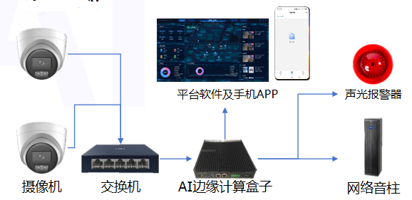 采用分层架构设计,包括前端设备层、网络传输层、AI分析层、管理平台层和应用层。前端设备层部署高清摄像头、烟火探测器、智能门禁等设备,覆盖生产现场的关键区域;网络传输层利用Wi-Fi、5G等无线技术及有线网络实现视频和数据的高速传输;AI分析层集成先进的AI视觉分析技术,对视频流进行实时分析,识别人员行为、区域入侵、吸烟行为、工服穿戴情况等;管理平台层提供资源展示、实时告警、设备管理、算法管理等功能,实现监控资源的集中管理;应用层则面向不同用户角色提供个性化的操作界面和功能模块,如生产经理可查看生产效率报告,安全主管可接收安全预警信息等。