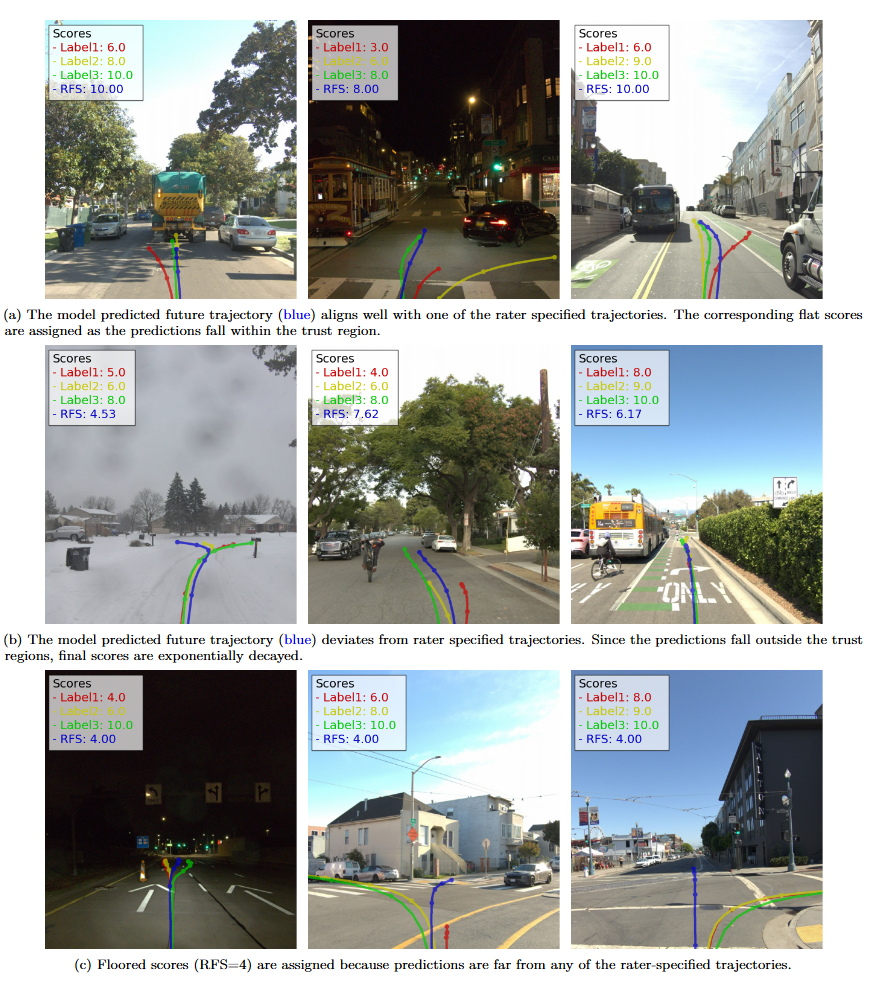 图7|RFS三种评分情形:贴合、偏离、失误。上:模型预测完全落在人类信任区内,获得满分。中:轨迹略微偏离理想路线,得分呈指数衰减。下:预测行为与人类方案完全不同(例如误转弯或加速过度),直接被判为最低分。这样的评分机制让AI的输出不再只追求“拟合”,而是真正贴近人类驾驶逻辑