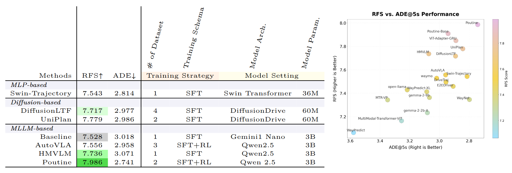 图6|三类模型的榜单表现:左表汇总了三种代表性方法——MLP类、扩散类与多模态大语言模型类(MLLM)——在WOD-E2E榜单上的成绩。右图展示了RFS与传统ADE指标的关系:两者相关性很弱,说明“距离正确”并不等于“行为安全”