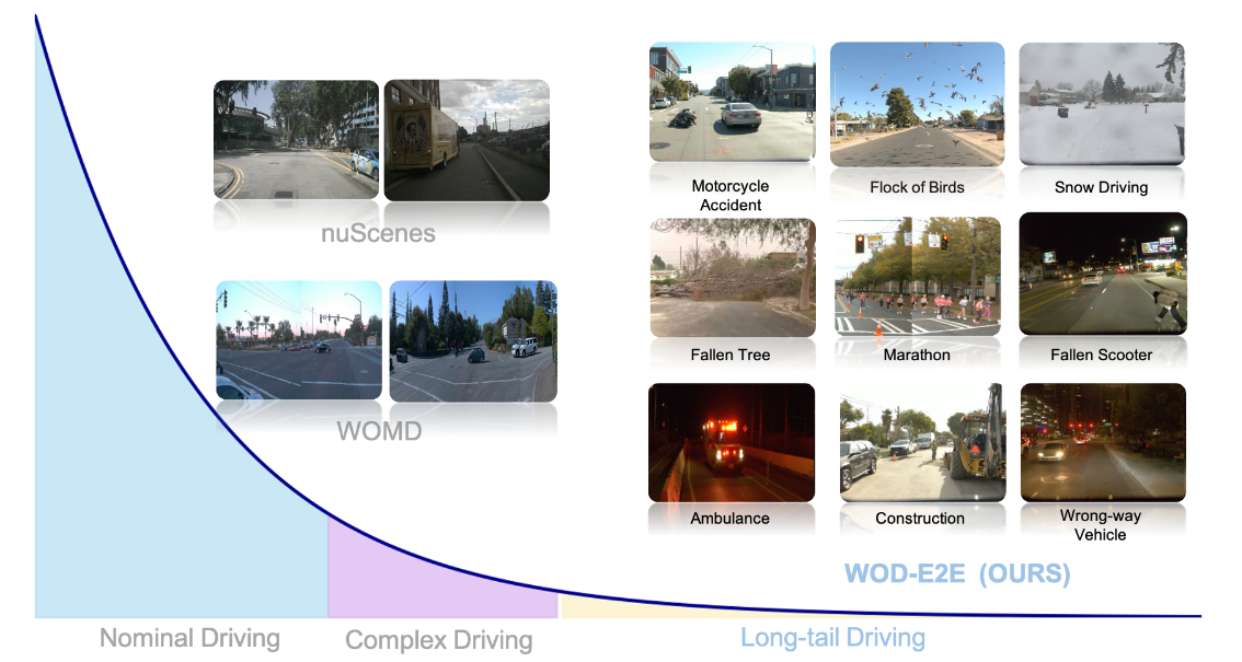 图1|现实中的“万分之一场景”:Waymo团队在WOD-E2E中精选出大量罕见却关键的道路情境:突发横穿的行人、掉落的障碍物、临时施工区、对向来车的意外切入……这些“长尾事件”在真实驾驶中出现概率不足0.03%,却恰恰是决定安全与否的关键时刻