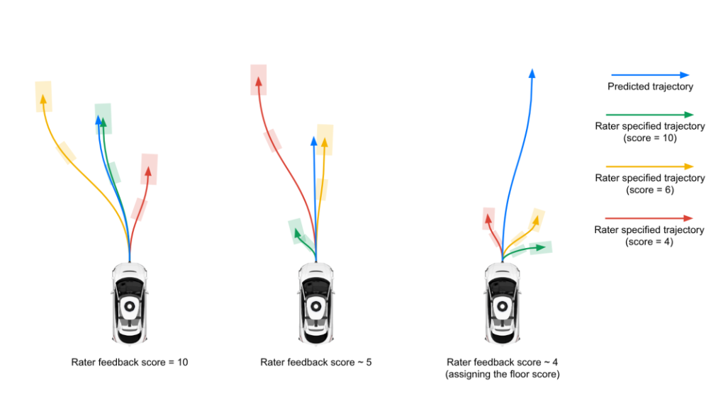 图5|RFS:让AI学会靠近人类判断:Rater Feedback Score的机制如图所示:蓝线为模型预测的轨迹,灰线为人类专家评出的三种驾驶方案。系统会根据预测轨迹是否落入高分轨迹的“信任区间”来打分——越贴近人类偏好,得分越高;偏离越远,分数则逐步衰减