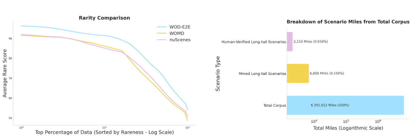 图3|数据稀有度对比:左图展示了多个主流自动驾驶数据集的“稀有度曲线”。可以看到,WOD-E2E在各百分位上的罕见事件占比都显著更高,说明它更集中地覆盖了那些真正棘手的场景。右图则显示了一个惊人的比例:在Waymo超过640万英里的行驶记录中,真正属于“长尾事件”的数据只占0.03%