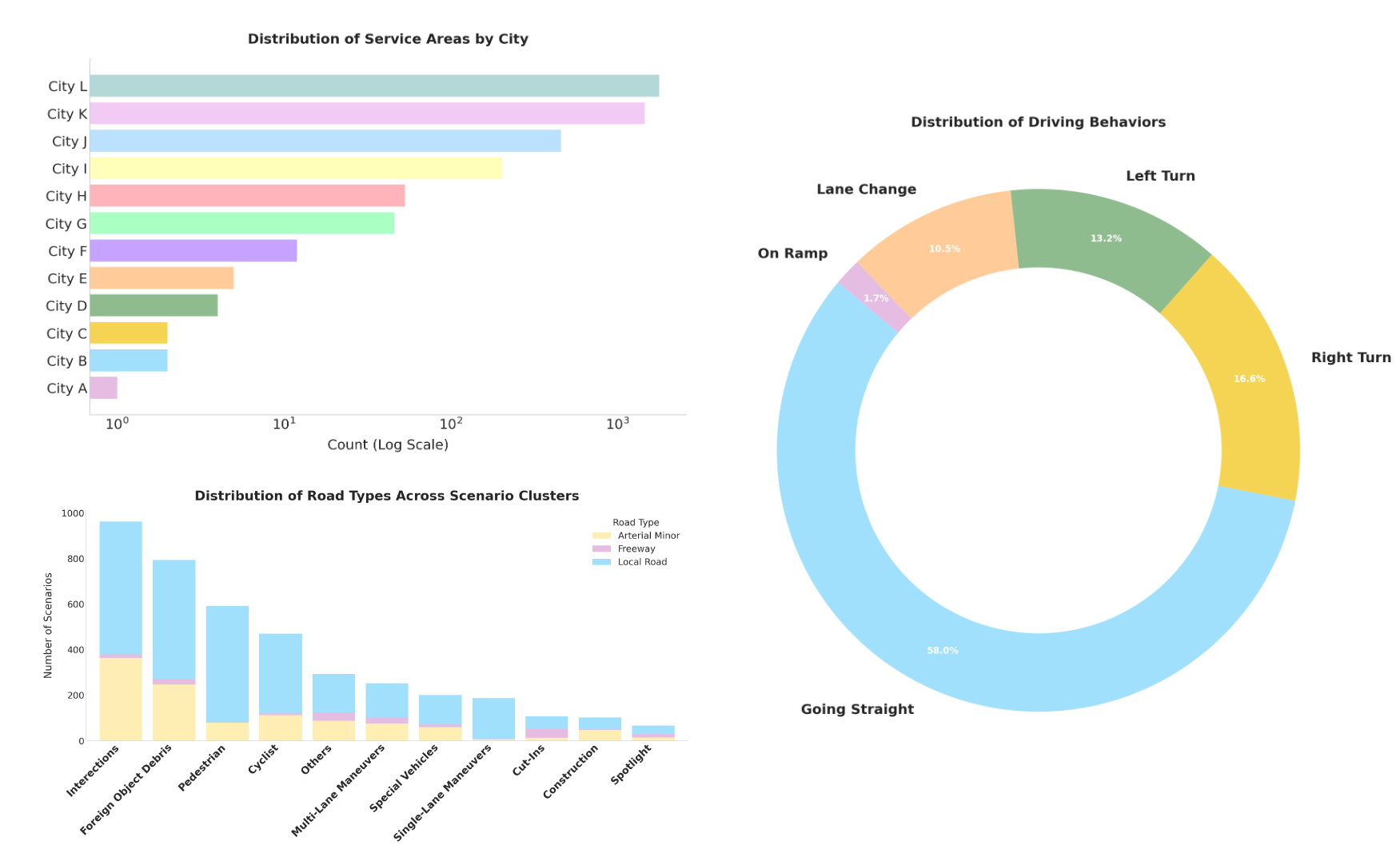 图2|WOD-E2E的全貌:城市、场景与行为分布:这张图从三个维度刻画了WOD-E2E的结构。左上为数据采集的城市分布,覆盖多样道路环境;左下展示了11类长尾场景(如行人、异物、施工、特种车辆等)在不同道路类型下的比例;右侧则描绘了驾驶行为统计——直行、变道、转弯与上匝道等,其中约三成数据来自高风险的交叉口操作