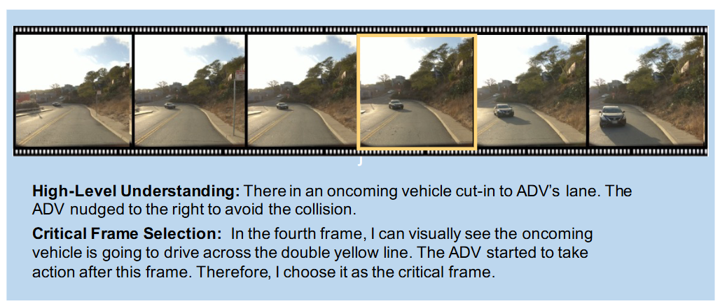 图4|人类标注员如何选出“关键一帧”:在标注过程中,人工评审者会先完整观看视频,理解事件背景,再挑出第一次出现关键风险的画面,即所谓的“关键帧”。这一帧往往是车辆开始采取行动(如减速、避让)的瞬间,也被记录为模型学习的决策起点