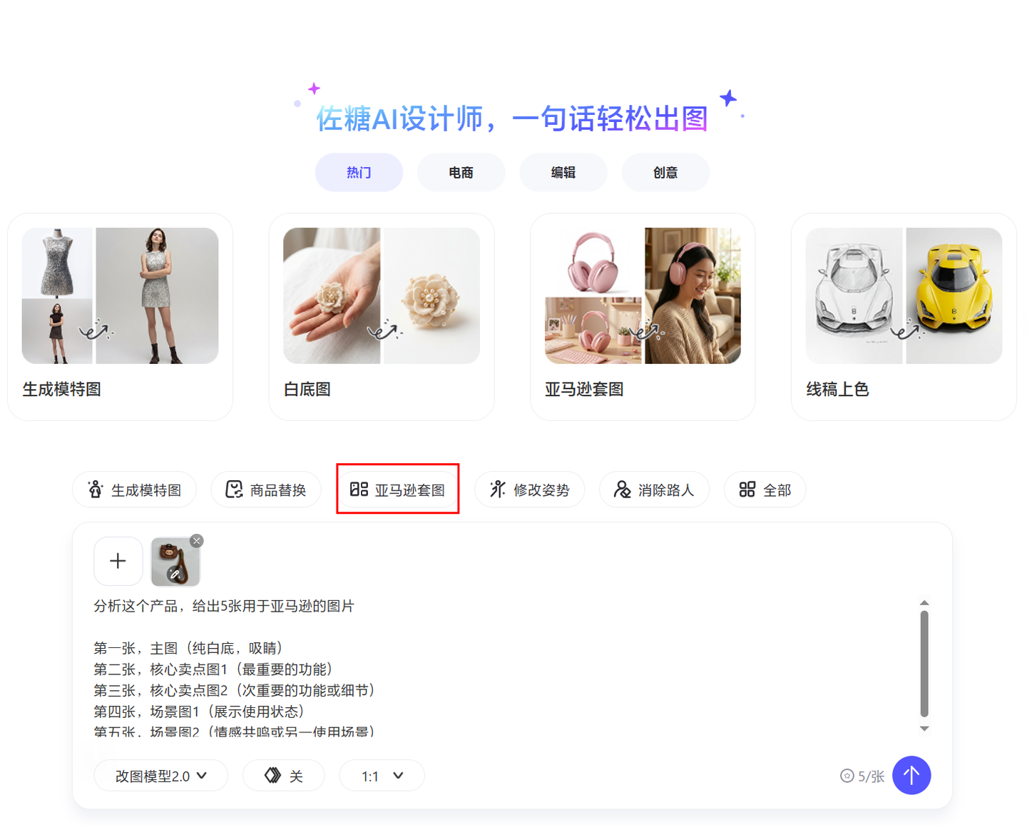 首先,我们测试佐糖 AI 设计师是否能生成完整的商品套图。工具自带了亚马逊套图模板,我直接使用模板里的提示词,上传了实拍图后点击发送。