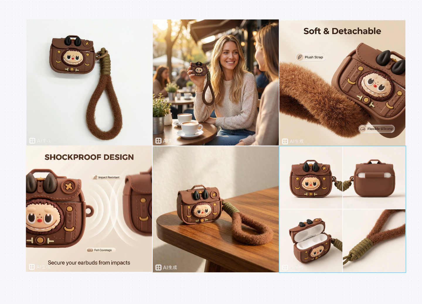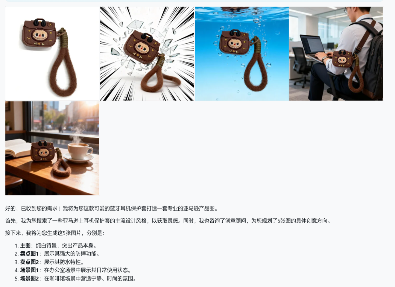 整个过程耗时约3分48秒,输出6张图片。商品主体和功能图还原度高,细节清晰,但场景图中模特手持耳机套的耳机比例偏大(实际蓝牙耳机较小)。整体效果可靠,可控性较强。