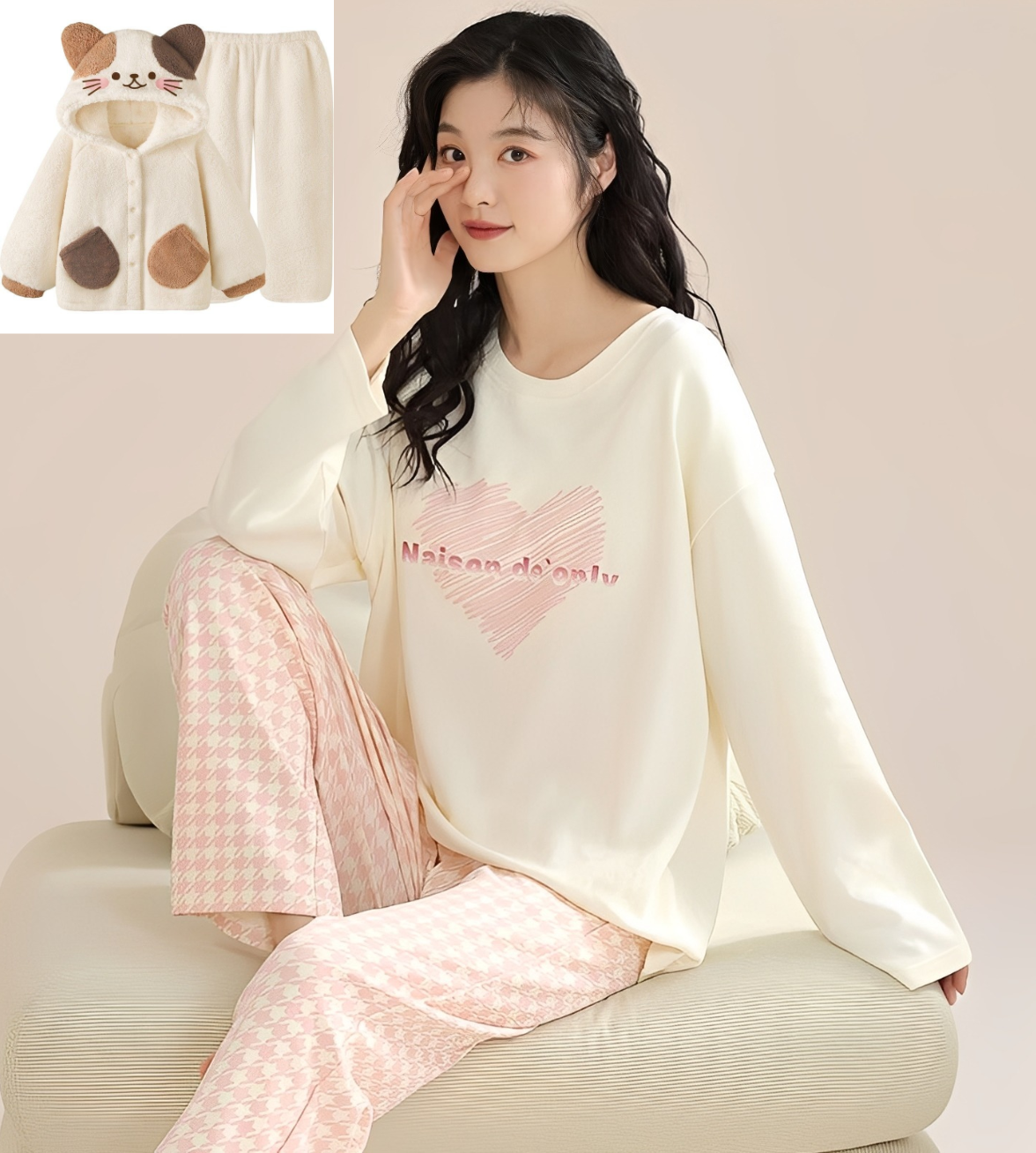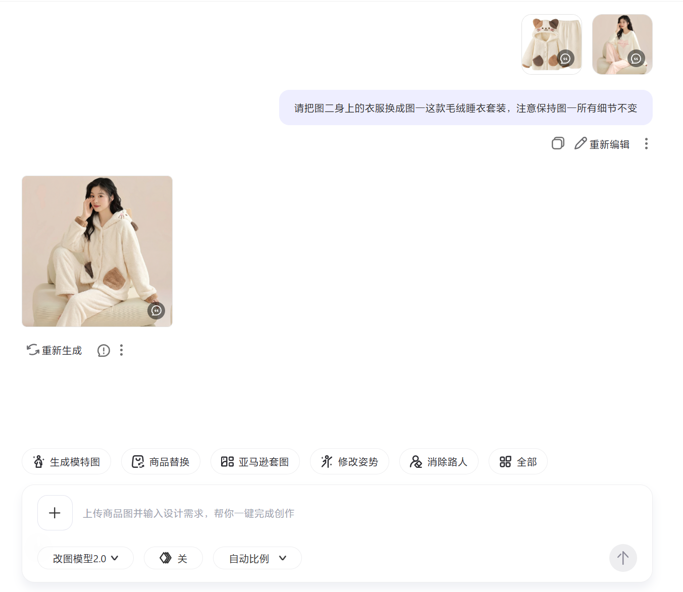 接下来测试给模特换装,上传睡衣和模特图,输入指令:【请把图二身上的衣服换成图一这款毛绒睡衣套装,注意保持图一所有细节不变】 ,消耗时长大约36秒,成后的模特图服装贴合度高,边缘处理自然,整体画面与原图协调,细节保真度较好。